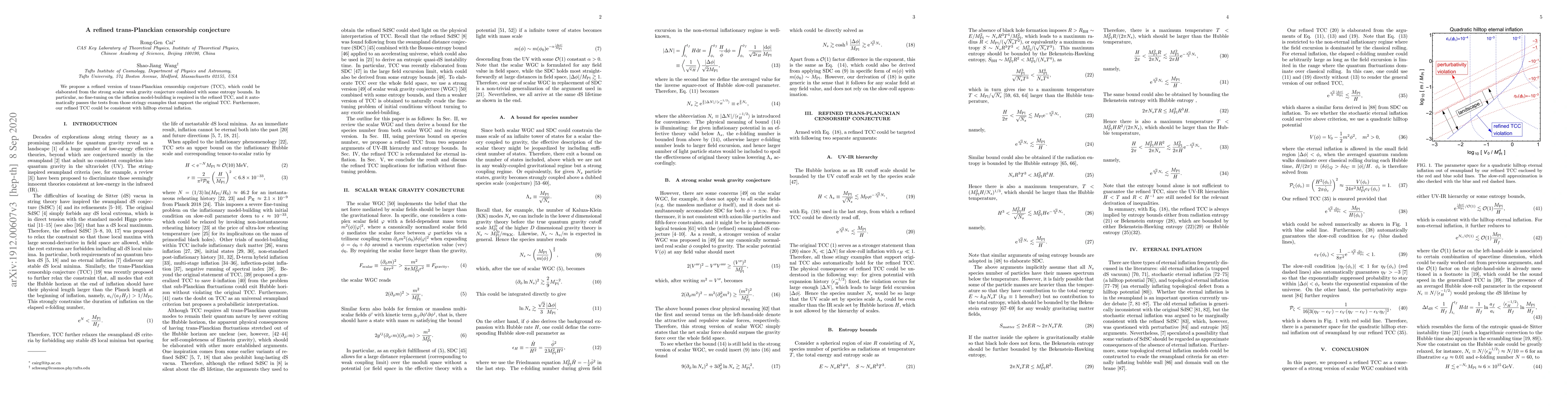 The paper proposes a refined version of the trans-Planckian censorship conjecture (TCC) derived from the strong scalar weak gravity conjecture and entropy bounds, eliminating the need for fine-tuning in inflation models and maintaining consistency with hilltop eternal inflation. The refined TCC passes tests from stringy examples supporting the original TCC.