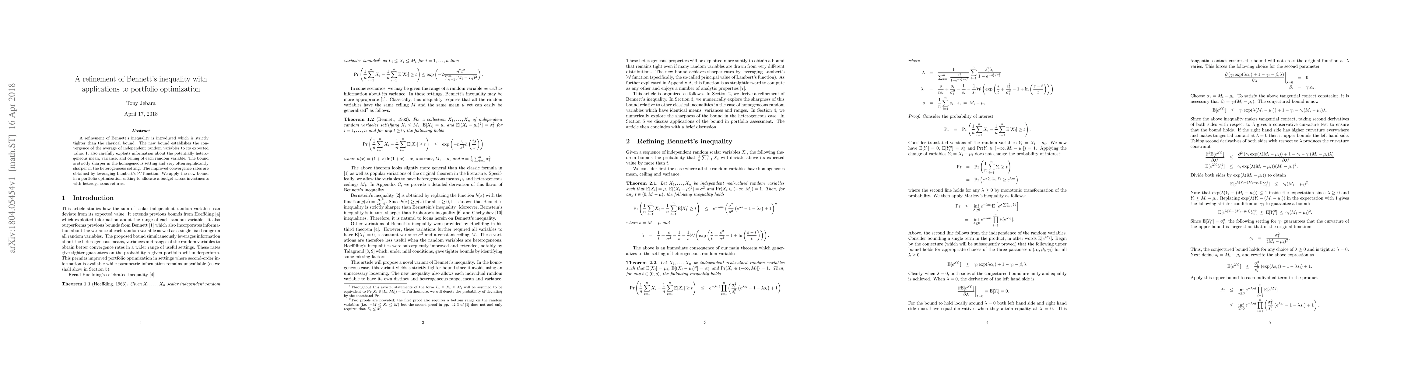 This paper refines Bennett's inequality to provide a tighter bound for the convergence of independent random variables, leveraging Lambert's W function. The improved inequality is applied to portfolio optimization to better allocate budgets across investments with varying returns.
