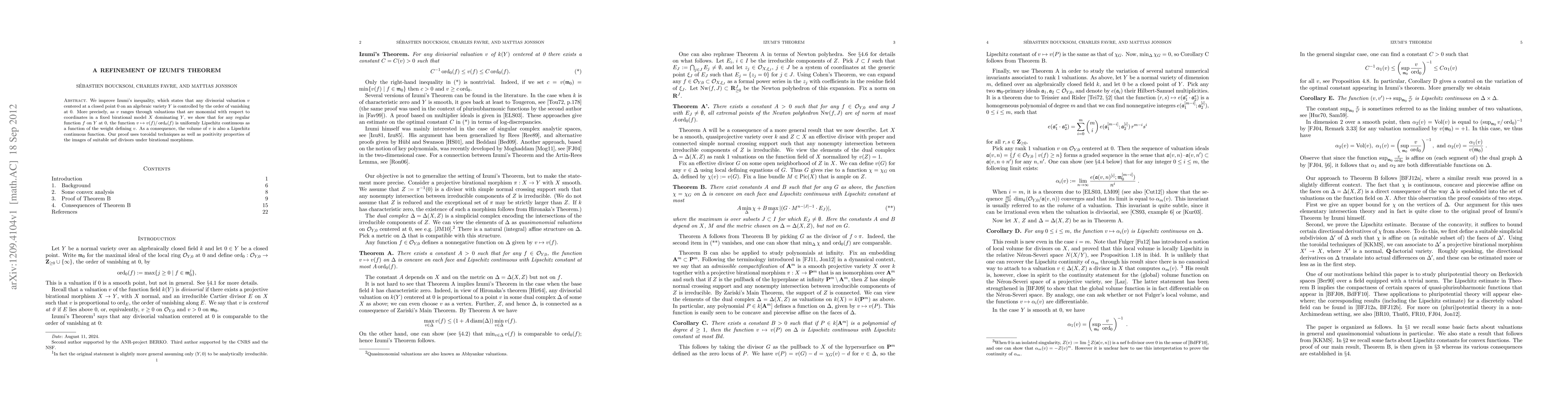 This paper refines Izumi's Theorem by demonstrating that the function v(f)/ord_0(f) for divisorial valuations v on an algebraic variety Y is uniformly Lipschitz continuous. The authors achieve this through toroidal techniques and the positivity of images of nef divisors under birational morphisms.