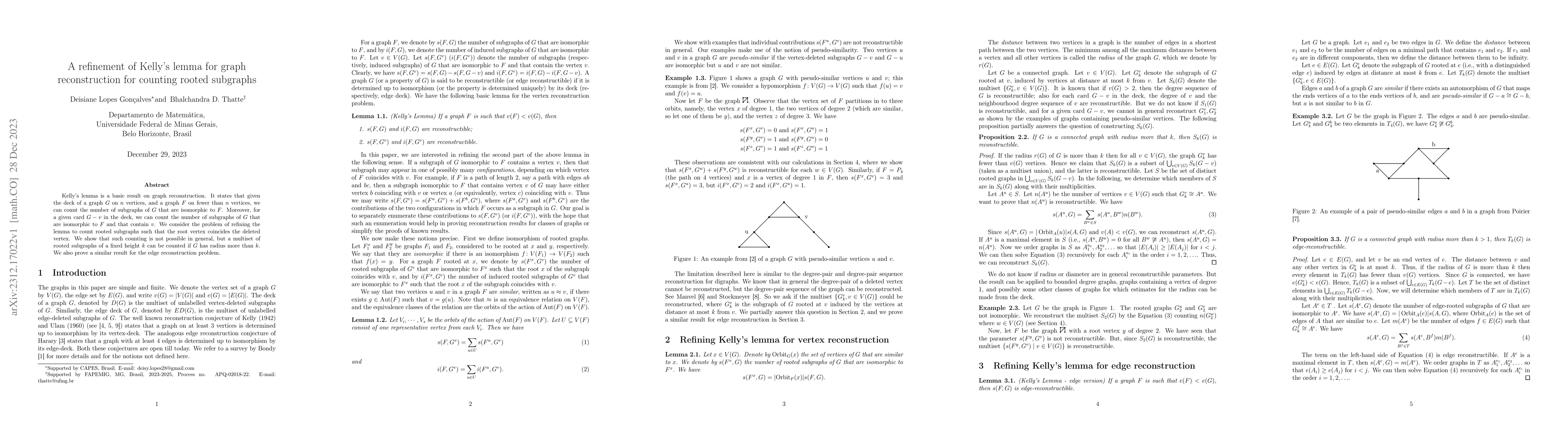 Summary: This paper refines Kelly's lemma to count rooted subgraphs where the root matches a deleted vertex. It demonstrates that general counting is infeasible but establishes a method for counting multisets of rooted subgraphs of fixed height when the graph's radius exceeds the height, also extending the result to edge reconstruction.
