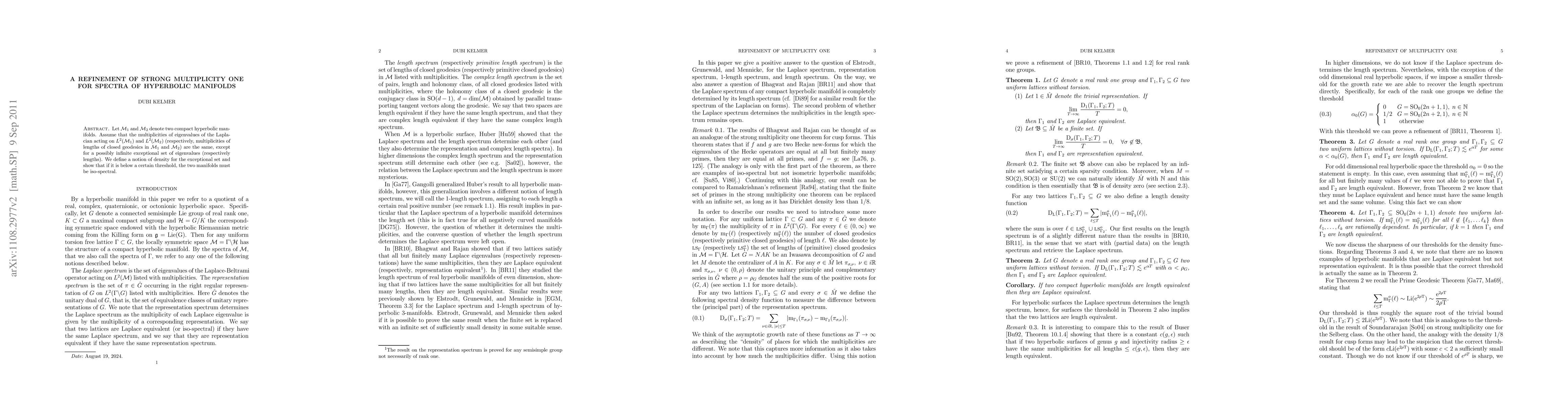 Let $\calM_1$ and $\calM_2$ denote two compact hyperbolic manifolds. Assume that the multiplicities of eigenvalues of the Laplacian acting on $L^2(\calM_1)$ and $L^2(\calM_2)$ (respectively, multiplicities of lengths of closed geodesics in $\calM_1$ and $\calM_2$) are the same, except for a possibly infinite exceptional set of eigenvalues (respectively lengths). We define a notion of density for the exceptional set and show that if it is below a certain threshold, the two manifolds must be iso-spectral.