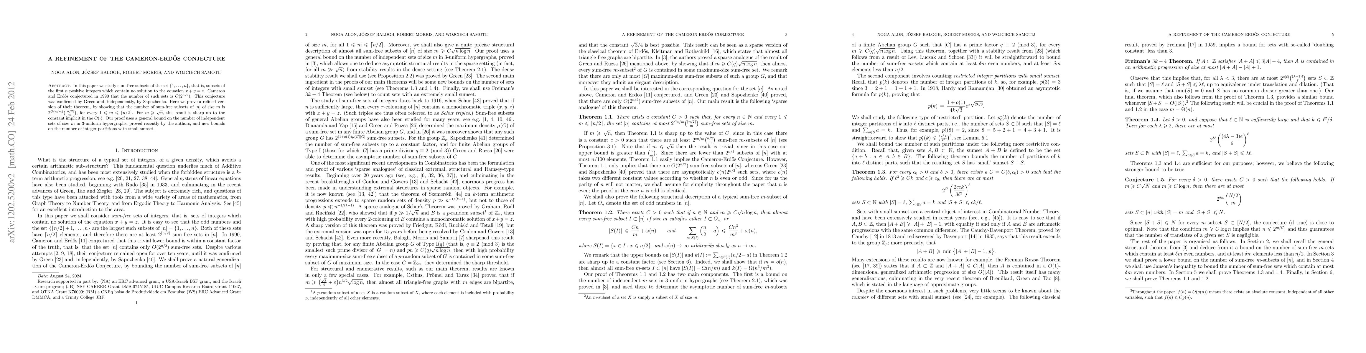 In this paper we study sum-free subsets of the set $\{1,...,n\}$, that is, subsets of the first $n$ positive integers which contain no solution to the equation $x + y = z$. Cameron and Erd\H{o}s conjectured in 1990 that the number of such sets is $O(2^{n/2})$. This conjecture was confirmed by Green and, independently, by Sapozhenko. Here we prove a refined version of their theorem, by showing that the number of sum-free subsets of $[n]$ of size $m$ is $2^{O(n/m)} {\lceil n/2 \rceil \choose m}$, for every $1 \le m \le \lceil n/2 \rceil$. For $m \ge \sqrt{n}$, this result is sharp up to the constant implicit in the $O(\cdot)$. Our proof uses a general bound on the number of independent sets of size $m$ in 3-uniform hypergraphs, proved recently by the authors, and new bounds on the number of integer partitions with small sumset.