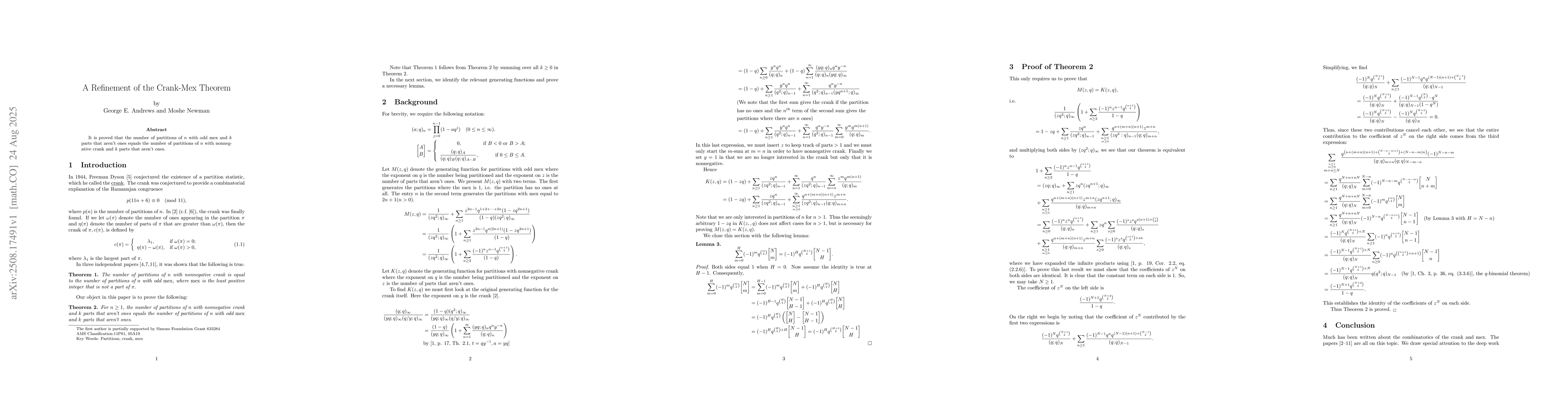 It is proved that the number of partitions of n with odd mex and k parts that aren't ones equals the number of partitions of n with nonnegative crank and k parts that aren't ones..