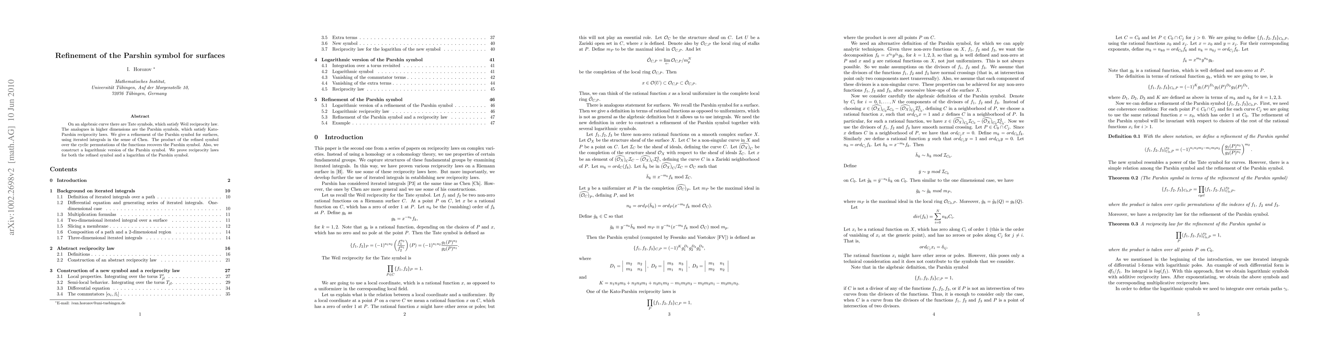 This paper refines the Parshin symbol for surfaces using Chen iterated integrals, constructing both a refined symbol and a logarithmic version. It proves reciprocity laws for these refined and logarithmic versions, ensuring their consistency with higher-dimensional analogues of Tate symbols.