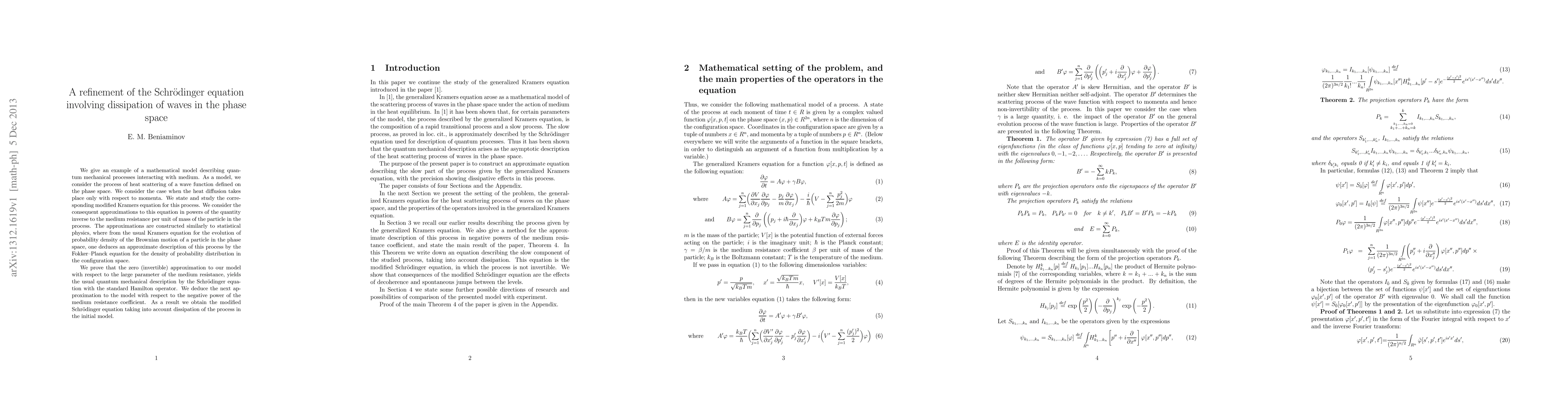 We give an example of a mathematical model describing quantum mechanical processes interacting with medium. As a model, we consider the process of heat scattering of a wave function defined on the phase space. We consider the case when the heat diffusion takes place only with respect to momenta. We state and study the corresponding modified Kramers equation for this process. We consider the consequent approximations to this equation in powers of the quantity inverse to the medium resistance per unit of mass of the particle in the process. The approximations are constructed similarly to statistical physics, where from the usual Kramers equation for the evolution of probability density of the Brownian motion of a particle in the phase space, one deduces an approximate description of this process by the Fokker--Planck equation for the density of probability distribution in the configuration space. We prove that the zero (invertible) approximation to our model with respect to the large parameter of the medium resistance, yields the usual quantum mechanical description by the Schr\"odinger equation with the standard Hamilton operator. We deduce the next approximation to the model with respect to the negative power of the medium resistance coefficient. As a result we obtain the modified Schr\"odinger equation taking into account dissipation of the process in the initial model.