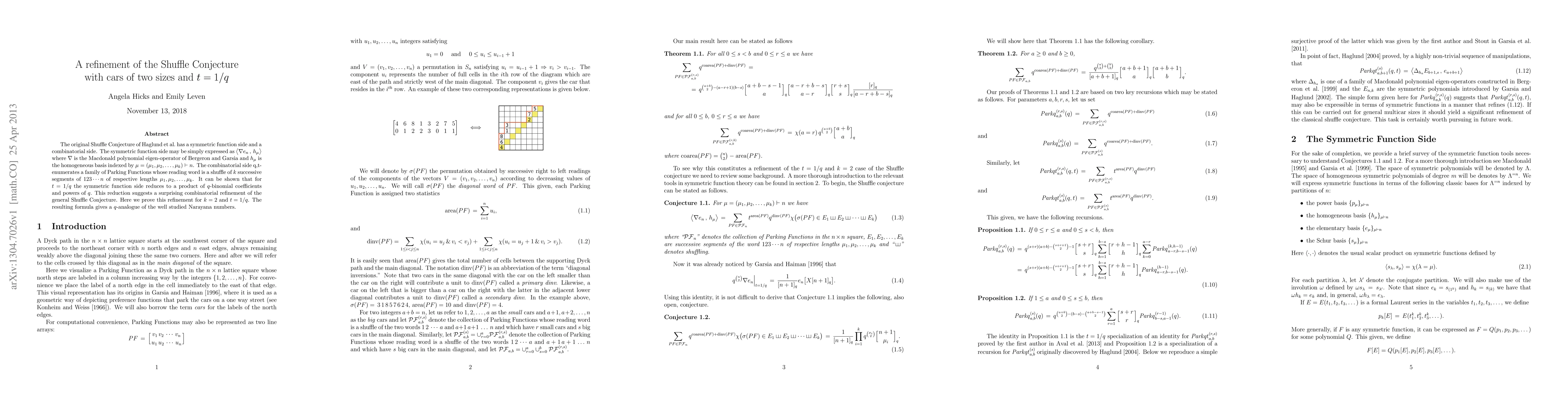 The original Shuffle Conjecture of Haglund et al. has a symmetric function side and a combinatorial side. The symmetric function side may be simply expressed as $<\nabla e_n, h_{\mu}>$ where \nabla is the Macdonald polynomial eigen-operator of Bergeron and Garsia and $h_\mu$ is the homogeneous basis indexed by $\mu=(\mu_1,\mu_2,...,\mu_k)$ partitions of n. The combinatorial side q,t-enumerates a family of Parking Functions whose reading word is a shuffle of k successive segments of 1,2,3,...,n of respective lengths $\mu_1,\mu_2,...,\mu_k$. It can be shown that for t=1/q the symmetric function side reduces to a product of q-binomial coefficients and powers of q. This reduction suggests a surprising combinatorial refinement of the general Shuffle Conjecture. Here we prove this refinement for k=2 and t=1/q. The resulting formula gives a q-analogue of the well studied Narayana numbers.