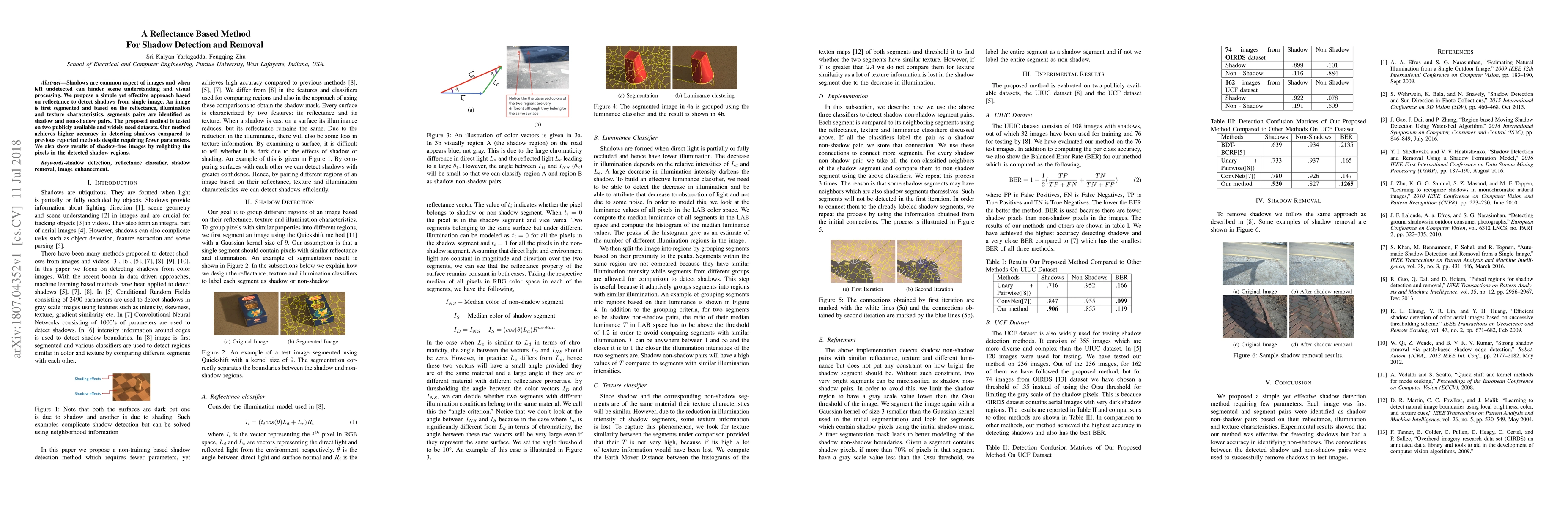 A new method using reflectance to detect shadows from single images achieves higher accuracy than previous methods while requiring fewer parameters. It can also remove shadows by relighting pixels in detected shadow regions.
