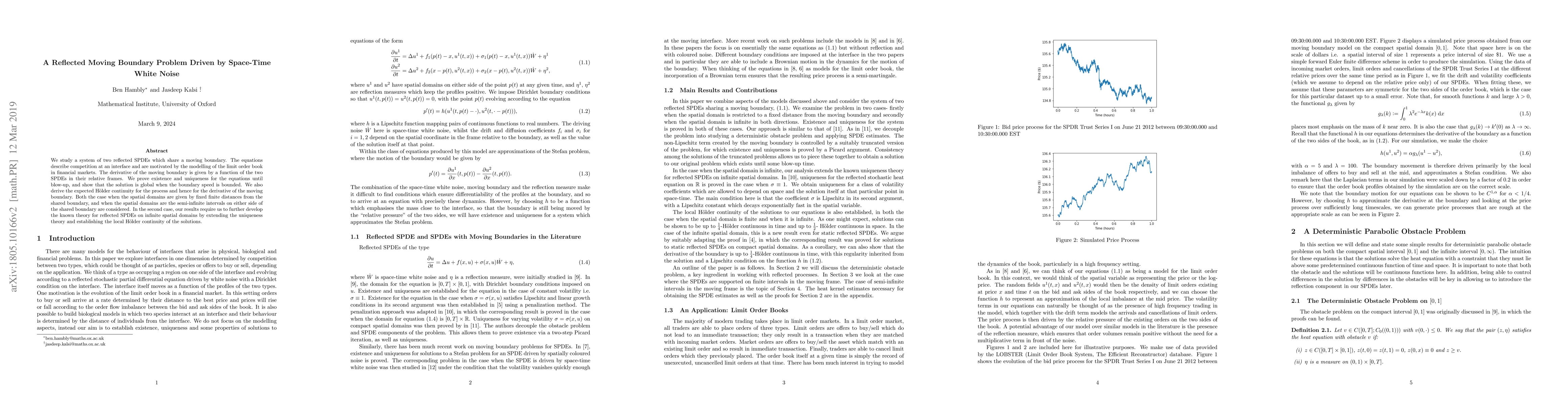 This research proves existence, uniqueness, and global solution properties for a system of stochastic partial differential equations (SPDEs) with a shared moving boundary, driven by space-time white noise. The study also extends the theory for reflected SPDEs on infinite domains, ensuring local Hölder continuity of solutions, with applications in modeling financial markets' limit order books.