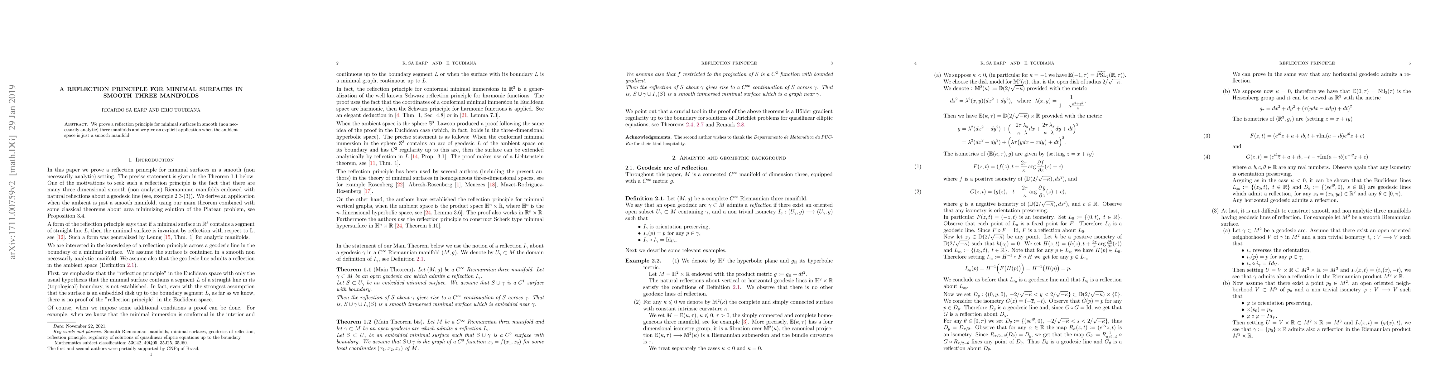 We prove a reflection principle for minimal surfaces in smooth (non necessarily analytic) three manifolds and we give an explicit application when the ambient space is just a smooth manifold.