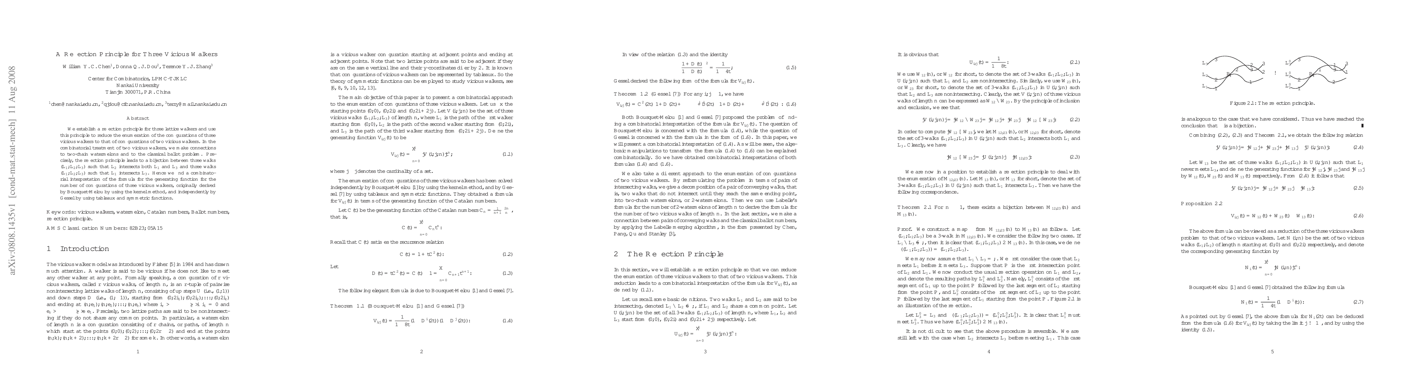 The paper establishes a reflection principle for three lattice walkers, reducing the enumeration of three vicious walkers' configurations to that of two vicious walkers using connections to two-chain watermelons and the classical ballot problem.