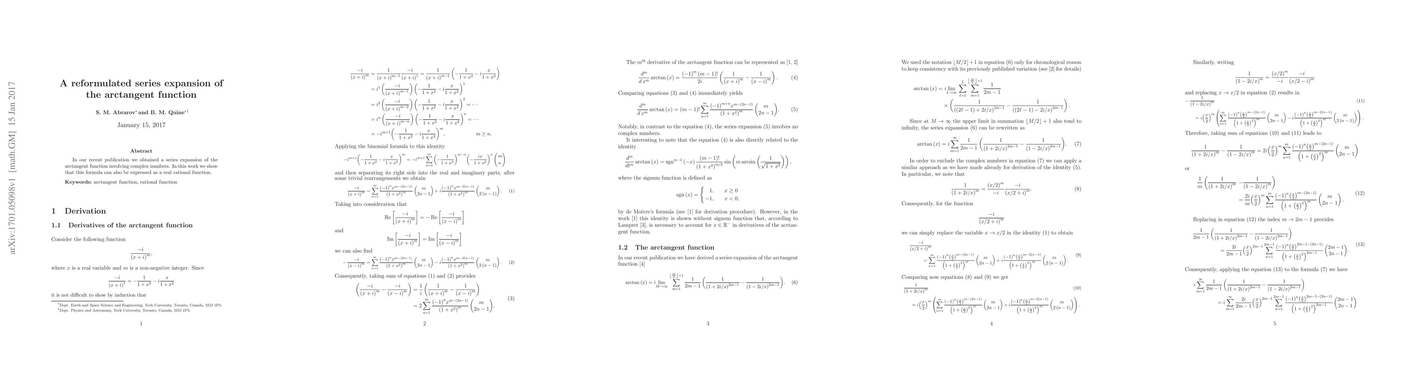 Summary: This paper reformulates a previously derived complex series expansion of the arctangent function into a real rational function, providing a new perspective on its analytical representation.