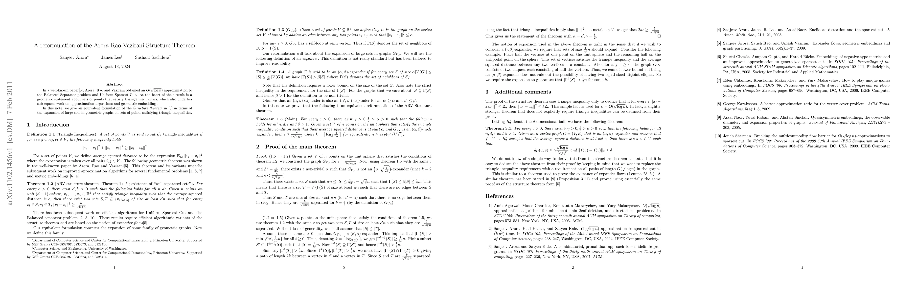 The paper provides a reformulation of the Arora-Rao-Vazirani (ARV) Structure Theorem using geometric graphs on sets of points satisfying triangle inequalities.