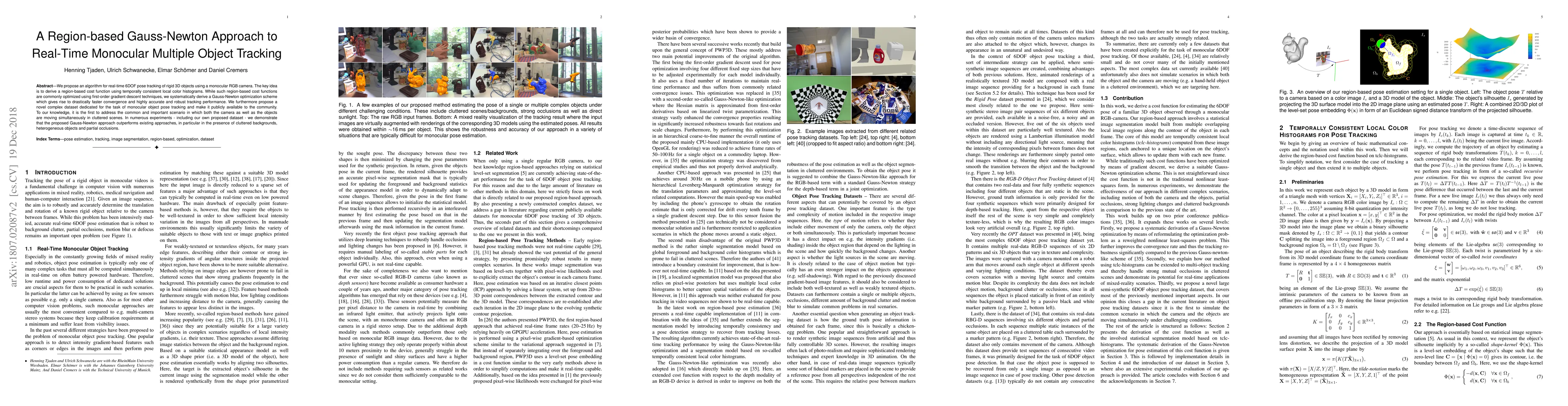 This paper introduces a region-based Gauss-Newton method for real-time 6DOF pose tracking of multiple 3D objects using a monocular RGB camera, achieving faster convergence and better robustness compared to gradient descent. The authors also release a new dataset for monocular object pose tracking, showcasing superior performance in cluttered environments.