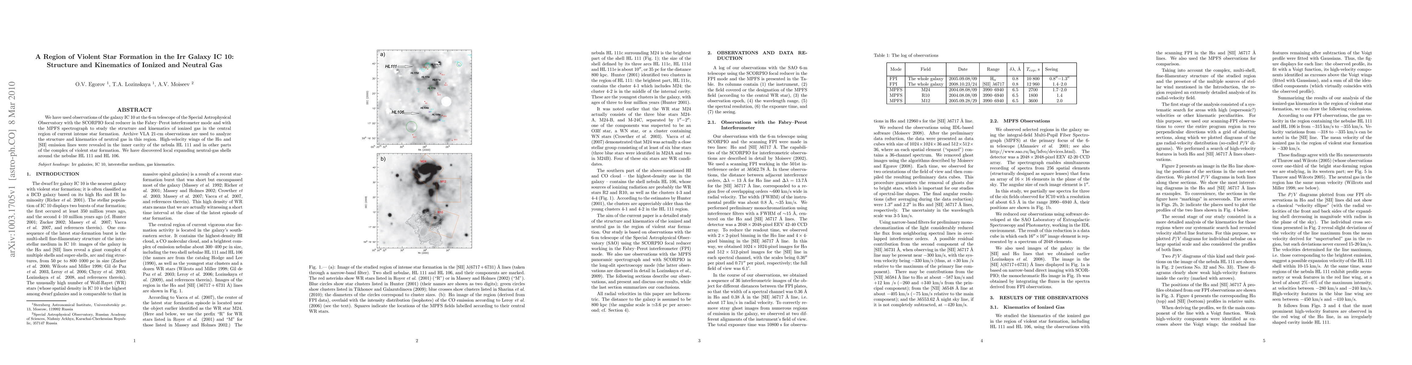 This paper investigates the structure and kinematics of ionized and neutral gas in the star-forming galaxy IC 10 using observations from the 6-m telescope and VLA. It reveals high-velocity gas wings and local expanding neutral-gas shells, indicating active star formation processes.