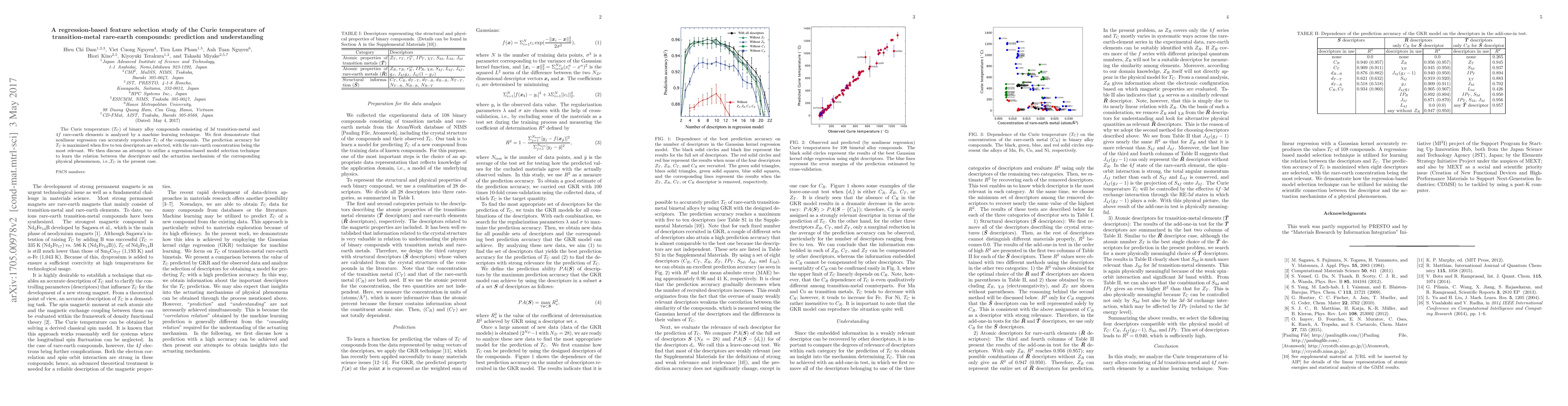 This study employs regression-based feature selection to predict the Curie temperature of transition-metal rare-earth compounds, finding that the most accurate predictions are achieved with five to ten descriptors, with rare-earth concentration being the most influential. The research also explores how regression models can elucidate the physical mechanisms behind the Curie temperature.