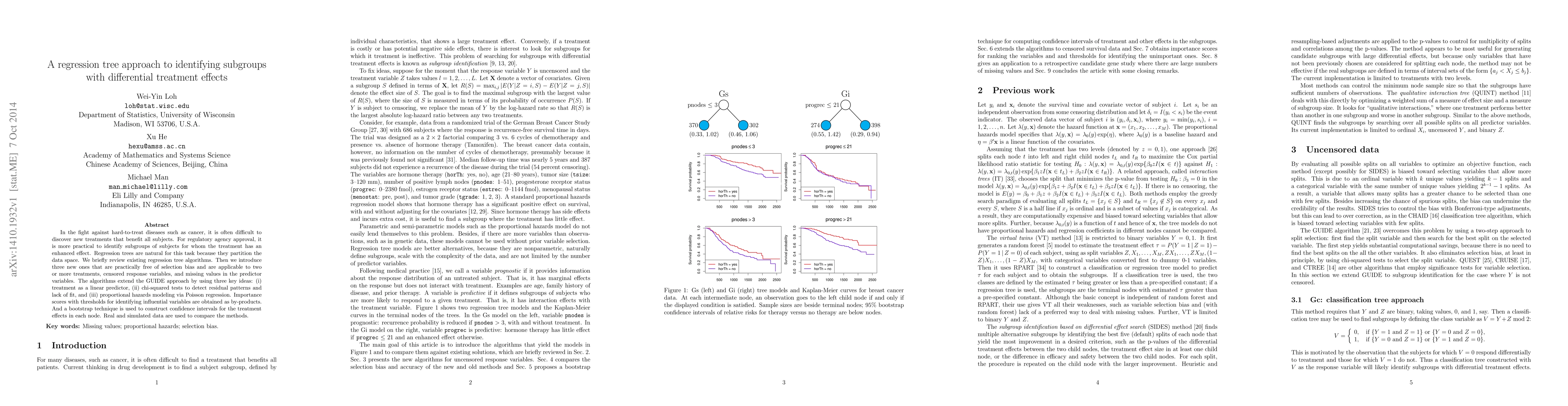 This paper proposes three new regression tree algorithms to identify subgroups with differential treatment effects in clinical trials, addressing issues like selection bias, censored data, and missing predictors. The methods utilize treatment as a linear predictor, chi-squared tests, and proportional hazards modeling, and are validated through both real and simulated data.