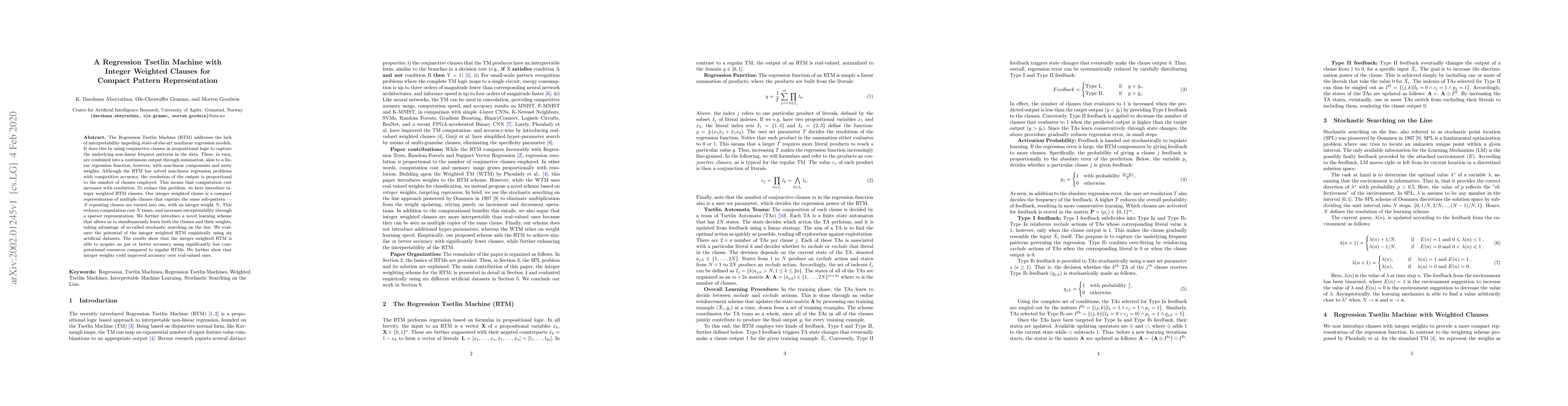 The paper presents a novel regression Tsetlin Machine with integer weighted clauses and a new learning scheme based on stochastic searching on the line, which reduces computational cost and enhances interpretability.