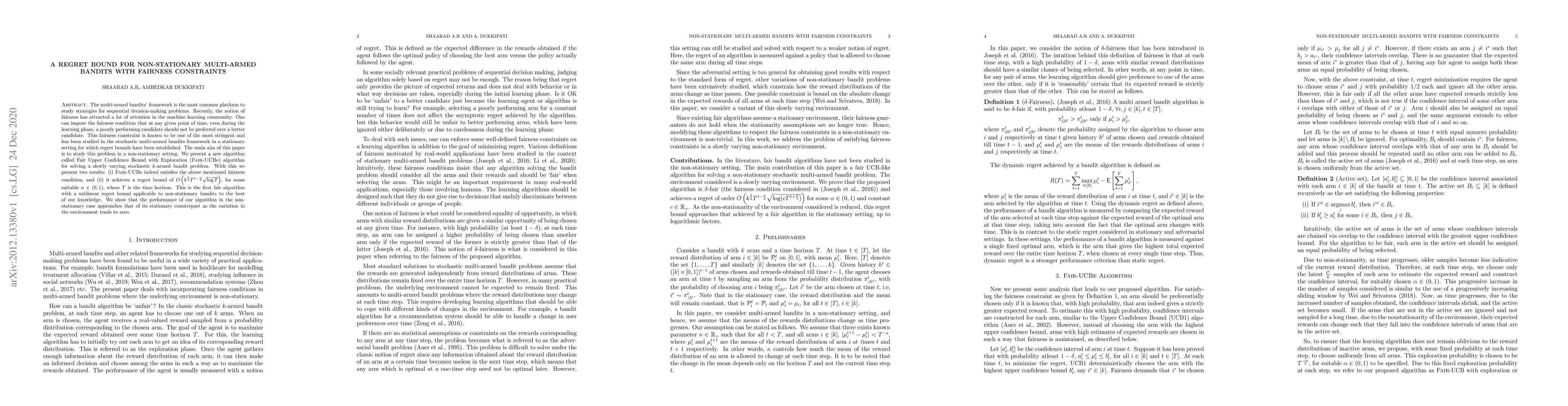 This paper introduces the Fair Upper Confidence Bound with Exploration (Fair-UCBe) algorithm for non-stationary multi-armed bandit problems, ensuring a fairness constraint that prioritizes better candidates. It achieves a regret bound of $O\left(k^{\frac{3}{2}} T^{1 - \frac{\alpha}{2}} \sqrt{\log T}\right)$ and demonstrates that its performance converges to that of its stationary counterpart as environmental changes diminish.