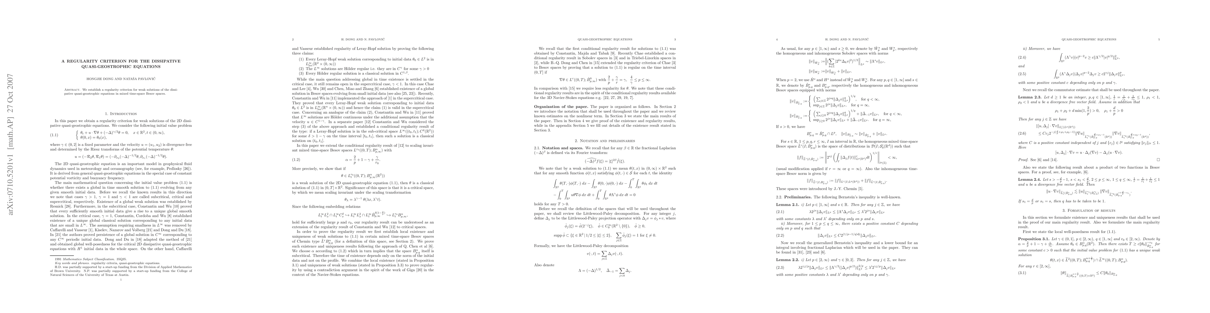Summary: This paper presents a regularity criterion for weak solutions of the dissipative quasi-geostrophic equations, utilizing mixed time-space Besov spaces to determine conditions under which the solutions remain regular.