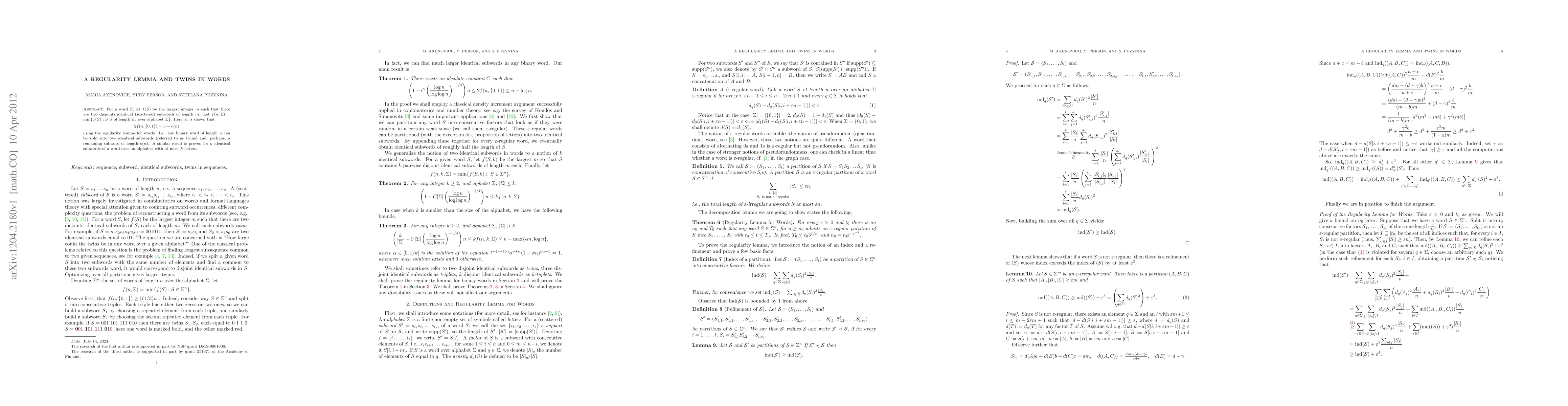This paper introduces a regularity lemma for words, showing that any binary word of length n can be split into two identical subwords (twins) and a remaining subword of length o(n). A similar result is proven for k identical subwords in words over an alphabet with at most k letters.