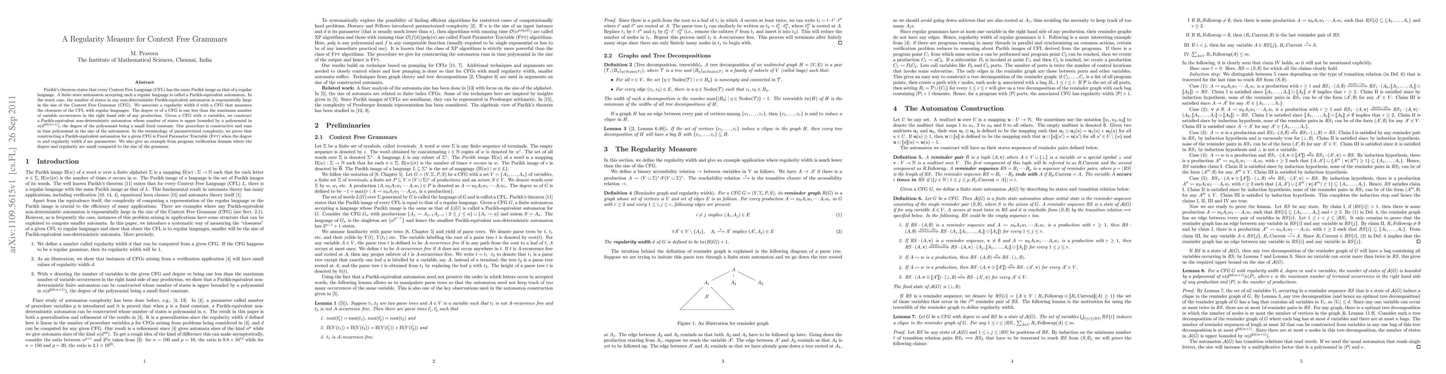Parikh's theorem states that every Context Free Language (CFL) has the same Parikh image as that of a regular language. A finite state automaton accepting such a regular language is called a Parikh-equivalent automaton. In the worst case, the number of states in any non-deterministic Parikh-equivalent automaton is exponentially large in the size of the Context Free Grammar (CFG). We associate a regularity width d with a CFG that measures the closeness of the CFL with regular languages. The degree m of a CFG is one less than the maximum number of variable occurrences in the right hand side of any production. Given a CFG with n variables, we construct a Parikh-equivalent non-deterministic automaton whose number of states is upper bounded by a polynomial in $n (d^{2d(m+1)}), the degree of the polynomial being a small fixed constant. Our procedure is constructive and runs in time polynomial in the size of the automaton. In the terminology of parameterized complexity, we prove that constructing a Parikh-equivalent automaton for a given CFG is Fixed Parameter Tractable (FPT) when the degree m and regularity width d are parameters. We also give an example from program verification domain where the degree and regularity are small compared to the size of the grammar.