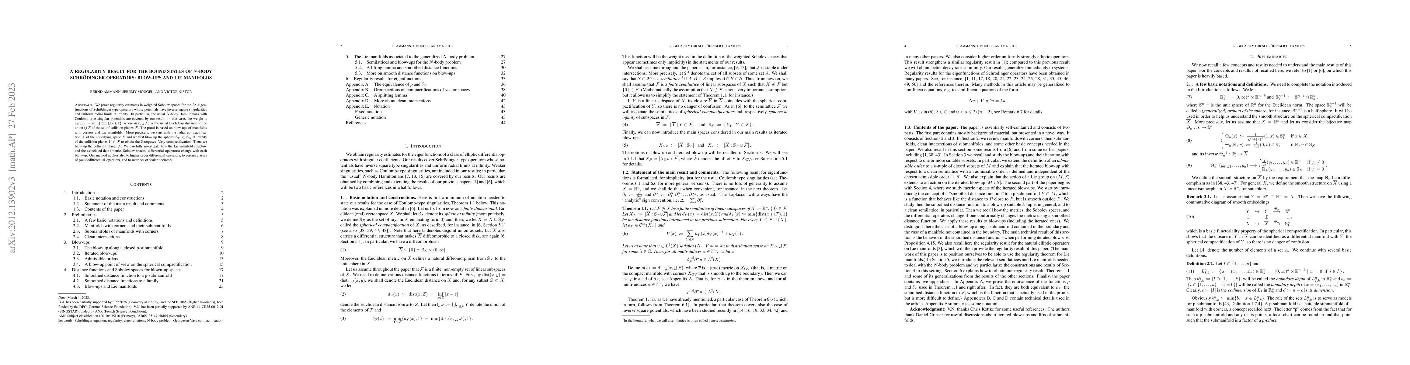We prove regularity estimates in weighted Sobolev spaces for the $L^2$-eigenfunctions of Schr\"odinger type operators whose potentials have inverse square singularities and uniform radial limits at infinity. In particular, the usual $N$-body Hamiltonians with Coulomb-type singular potentials are covered by our result: in that case, the weight is $\delta_{\mathcal{F}}(x) := \min \{ d(x, \bigcup \mathcal{F}), 1\}$, where $d(x, \bigcup \mathcal{F})$ is the usual euclidean distance to the union $\bigcup\mathcal{F}$ of the set of collision planes $\bigcup\mathcal{F}$. The proof is based on blow-ups of manifolds with corners and Lie manifolds. More precisely, we start with the radial compactification $\overline{X}$ of the underlying space $X$ and we first blow-up the spheres $\mathbb{S}_Y \subset \mathbb{S}_X$ at infinity of the collision planes $Y \in \bigcup\mathcal{F}$ to obtain the Georgescu-Vasy compactification. Then we blow-up the collision planes $\bigcup\mathcal{F}$. We carefully investigate how the Lie manifold structure and the associated data (metric, Sobolev spaces, differential operators) change with each blow-up. Our method applies also to higher order differential operators, to certain classes of pseudodifferential operators, and to matrices of scalar operators.