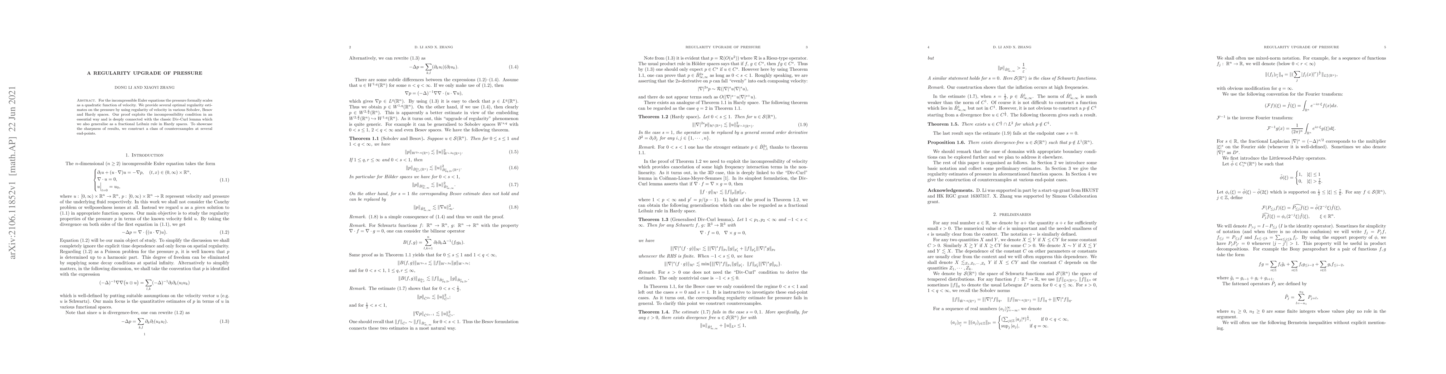 For the incompressible Euler equations the pressure formally scales as a quadratic function of velocity. We provide several optimal regularity estimates on the pressure by using regularity of velocity in various Sobolev, Besov and Hardy spaces. Our proof exploits the incompressibility condition in an essential way and is deeply connected with the classic Div-Curl lemma which we also generalise as a fractional Leibniz rule in Hardy spaces. To showcase the sharpness of results, we construct a class of counterexamples at several end-points.