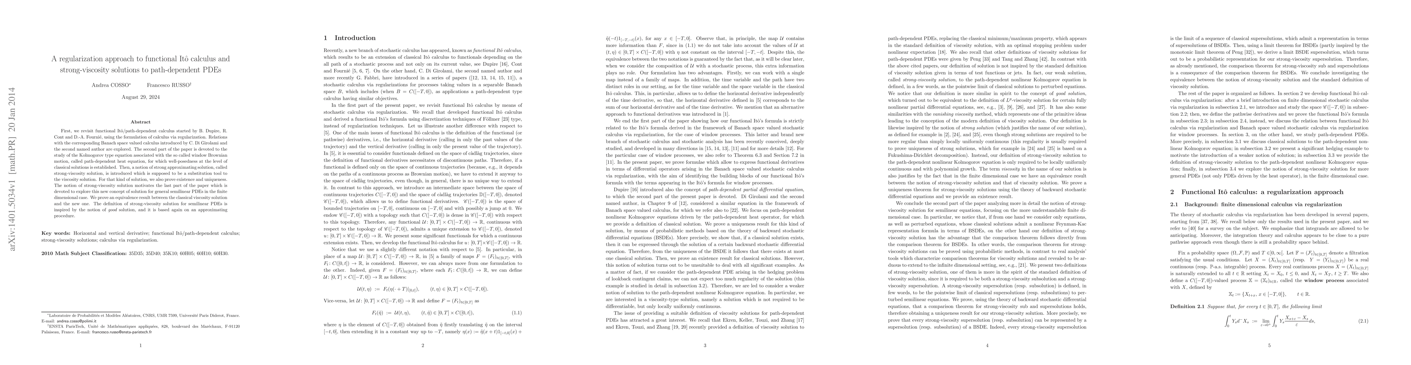 First, we revisit functional It\^o/path-dependent calculus started by B. Dupire, R. Cont and D.-A. Fourni\'e, using the formulation of calculus via regularization. Relations with the corresponding Banach space valued calculus introduced by C. Di Girolami and the second named author are explored. The second part of the paper is devoted to the study of the Kolmogorov type equation associated with the so called window Brownian motion, called path-dependent heat equation, for which well-posedness at the level of classical solutions is established. Then, a notion of strong approximating solution, called strong-viscosity solution, is introduced which is supposed to be a substitution tool to the viscosity solution. For that kind of solution, we also prove existence and uniqueness. The notion of strong-viscosity solution motivates the last part of the paper which is devoted to explore this new concept of solution for general semilinear PDEs in the finite dimensional case. We prove an equivalence result between the classical viscosity solution and the new one. The definition of strong-viscosity solution for semilinear PDEs is inspired by the notion of "good" solution, and it is based again on an approximating procedure.