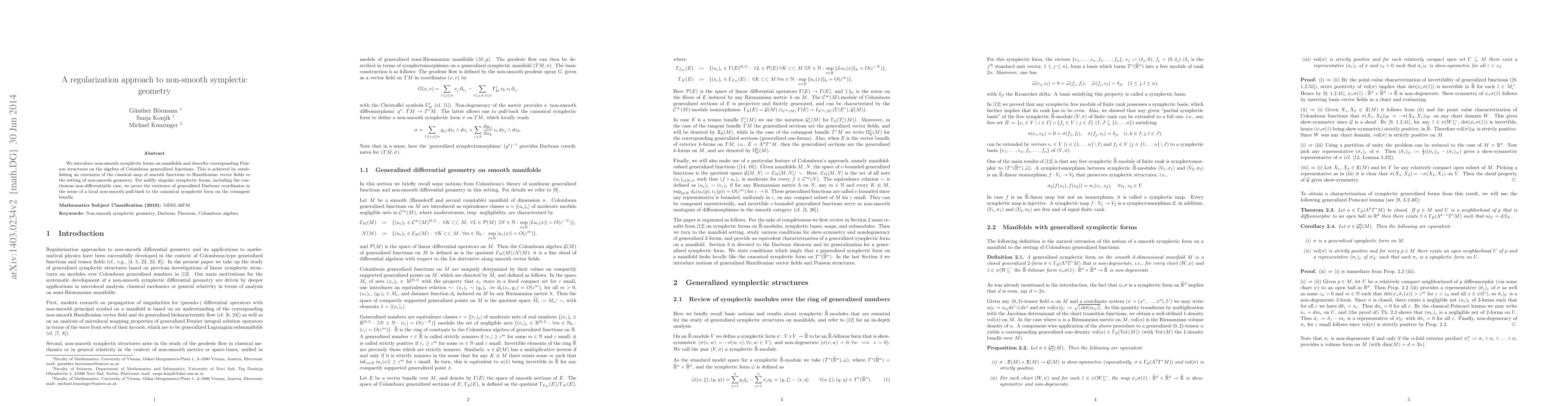 This paper introduces non-smooth symplectic forms on manifolds and extends classical Hamiltonian vector fields to this setting, proving the existence of generalized Darboux coordinates for mildly singular forms using Colombeau generalized functions.