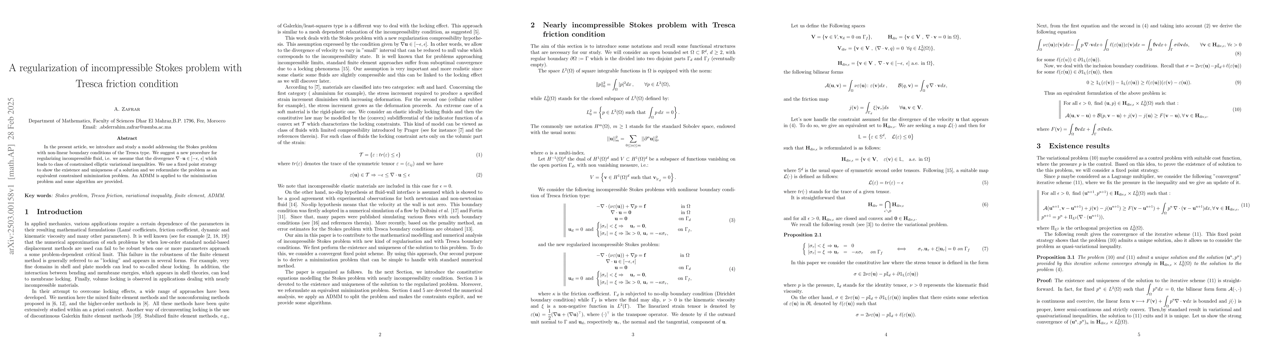 The introduction of a regularization technique for incompressible Stokes problems with Tresca friction conditions, along with a fixed-point existence proof and an ADMM algorithm for solving the resulting constrained minimization problem.
