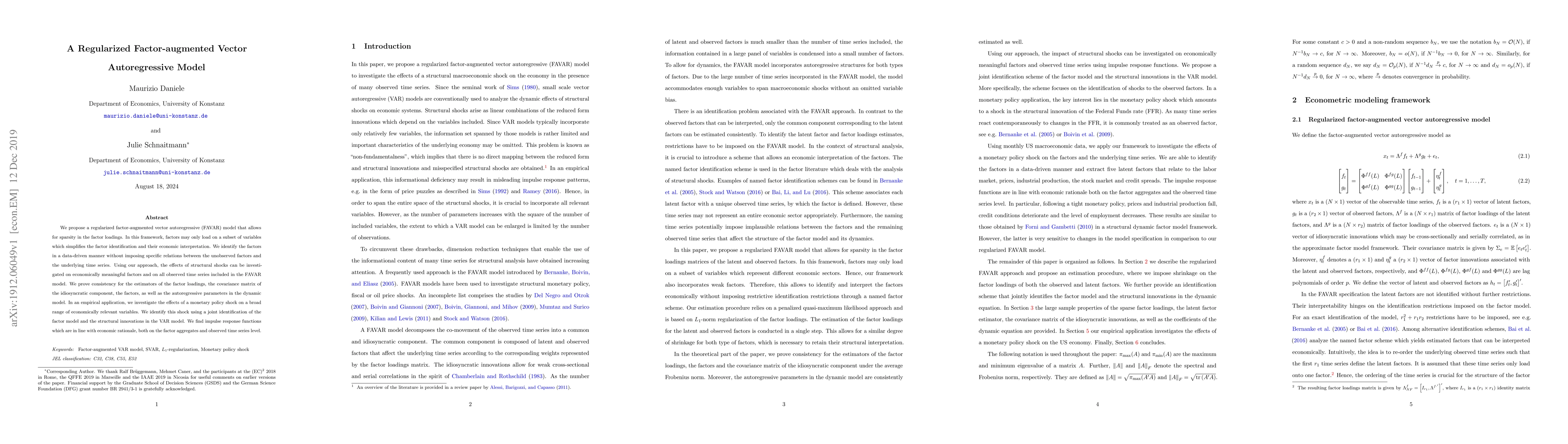 This paper proposes a regularized factor-augmented vector autoregressive (FAVAR) model that incorporates sparsity in factor loadings, simplifying factor identification and economic interpretation. The authors demonstrate the model's consistency and apply it to analyze the impact of monetary policy shocks, finding impulse responses consistent with economic theory.