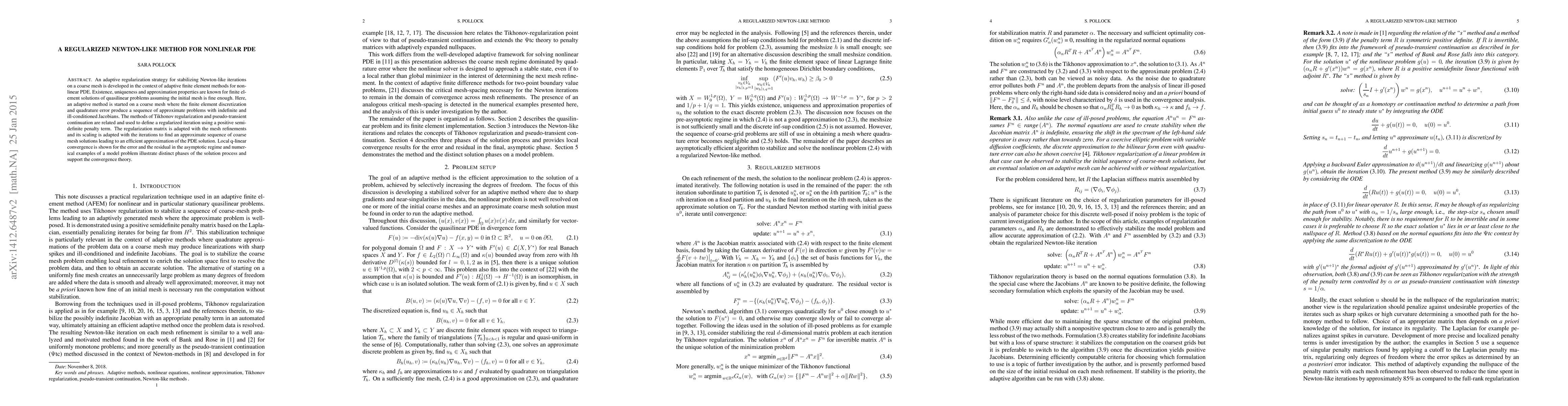 A new adaptive method is introduced to solve nonlinear PDEs on coarse meshes, using a regularized Newton-like approach to stabilize the iterations. The method shows local q-linear convergence in the asymptotic regime and performs efficiently with numerical examples.