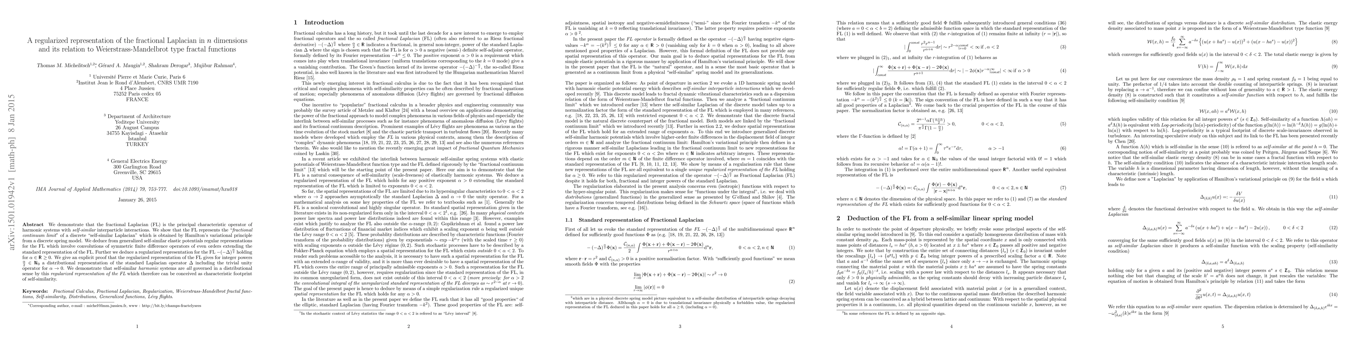 We demonstrate that the fractional Laplacian (FL) is the principal characteristic operator of harmonic systems with {\it self-similar} interparticle interactions. We show that the FL represents the "{\it fractional continuum limit}" of a discrete "self-similar Laplacian" which is obtained by Hamilton's variational principle from a discrete spring model. We deduce from generalized self-similar elastic potentials regular representations for the FL which involve convolutions of symmetric finite difference operators of even orders extending the standard representation of the FL. Further we deduce a regularized representation for the FL $-(-\Delta)^{\frac{\alpha}{2}}$ holding for $\alpha\in \R \geq 0$. We give an explicit proof that the regularized representation of the FL gives for integer powers $\frac{\alpha}{2} \in \N\_0$ a distributional representation of the standard Laplacian operator $\Delta$ including the trivial unity operator for $\alpha\rightarrow 0$. We demonstrate that self-similar {\it harmonic} systems are {\it all} governed in a distributional sense by this {\it regularized representation of the FL} which therefore can be conceived as characteristic footprint of self-similarity.