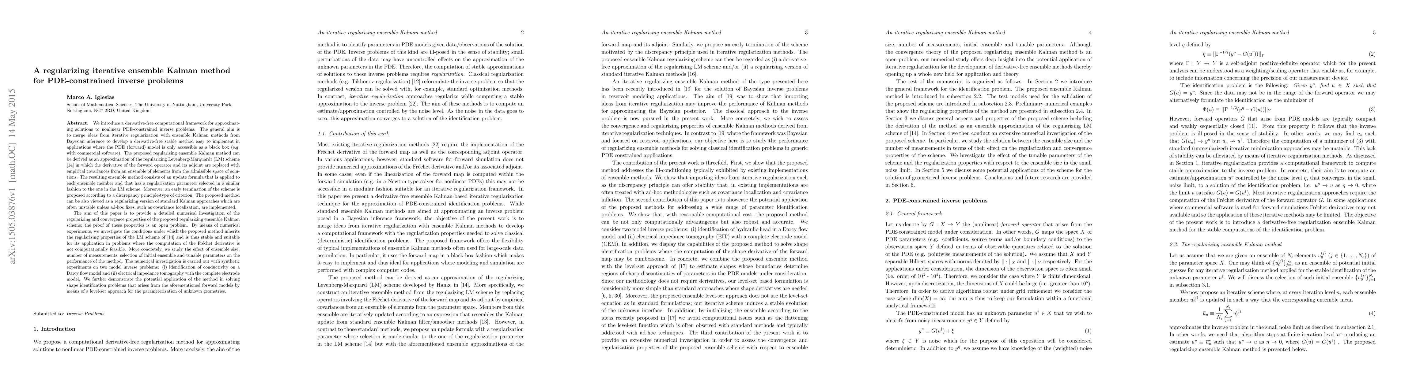 This paper proposes a derivative-free iterative ensemble Kalman method for solving nonlinear PDE-constrained inverse problems, merging regularization techniques with ensemble methods. The method replaces derivatives with empirical covariances and includes a regularization parameter and an early termination criterion, demonstrating stability and performance in synthetic experiments on Darcy flow and electrical impedance tomography.