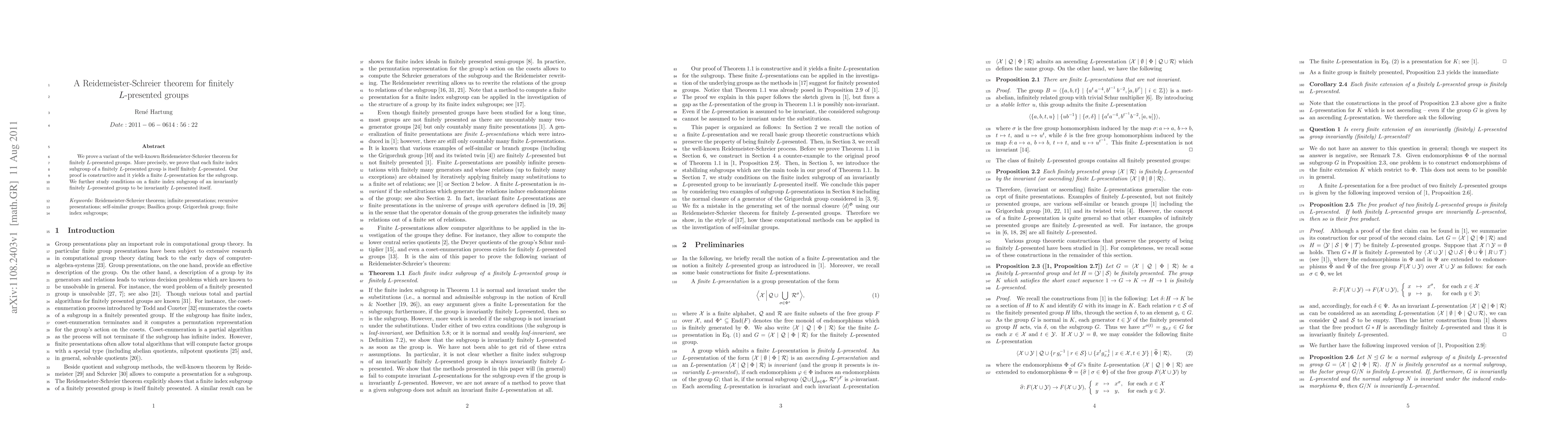 We prove a variant of the well-known Reidemeister-Schreier theorem for finitely $L$-presented groups. More precisely, we prove that each finite index subgroup of a finitely $L$-presented group is itself finitely $L$-presented. Our proof is constructive and it yields a finite $L$-presentation for the subgroup. We further study conditions on a finite index subgroup of an invariantly finitely $L$-presented group to be invariantly $L$-presented itself.