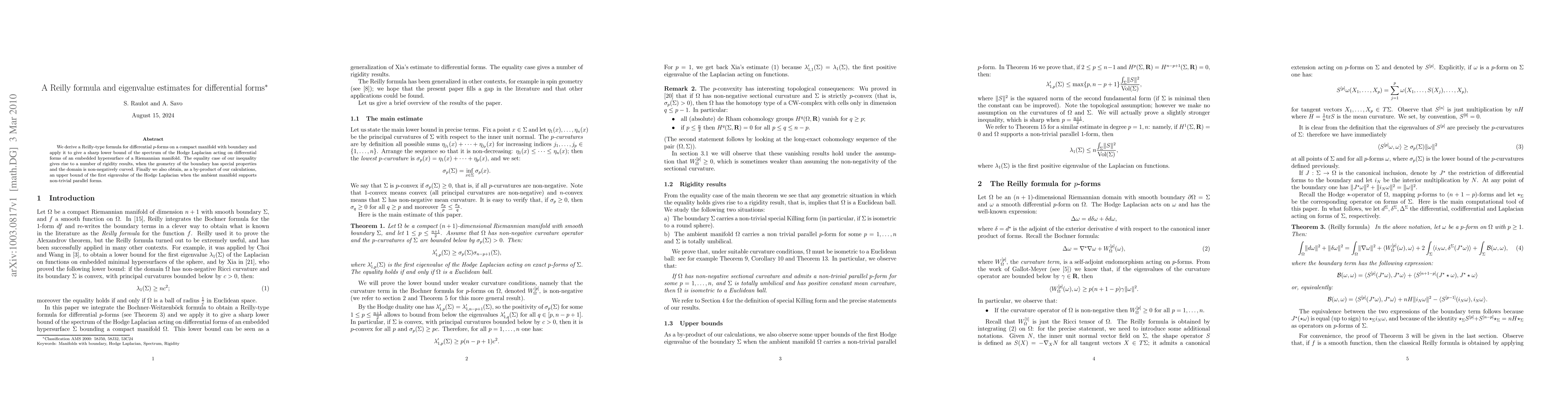 This paper derives a Reilly-type formula for differential p-forms on compact manifolds with boundary, using it to establish a sharp lower bound for the Hodge Laplacian spectrum on embedded hypersurfaces. It also provides rigidity results under specific boundary geometry and non-negative curvature, and an upper bound for the first eigenvalue in the presence of non-trivial parallel forms.