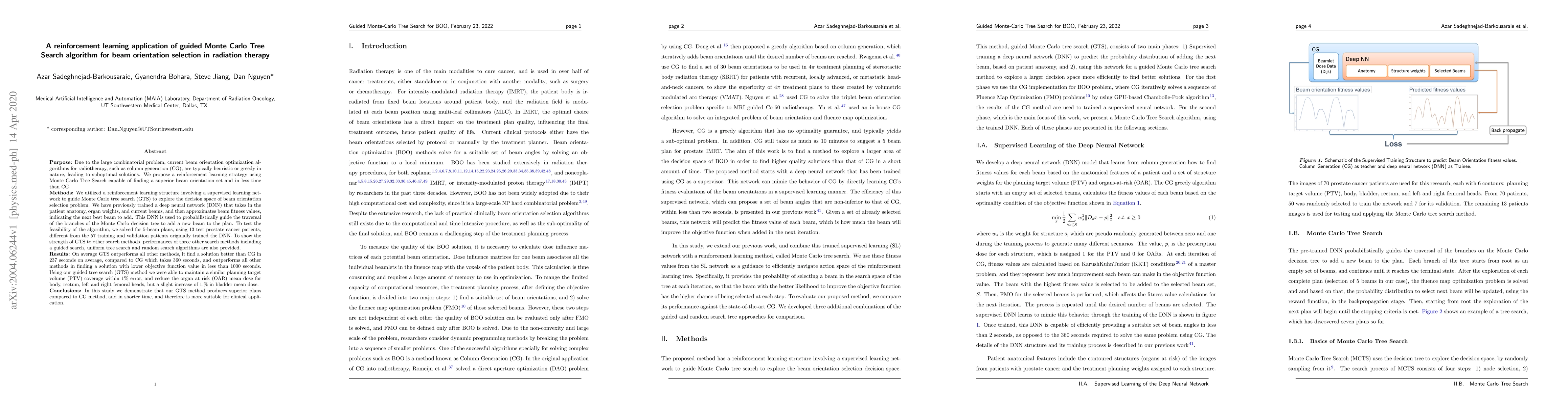 This paper proposes a reinforcement learning approach using guided Monte Carlo Tree Search (GTS) to optimize beam orientation in radiation therapy, achieving superior solutions faster than traditional heuristic methods. The GTS method, guided by a trained deep neural network, outperforms other search methods in both solution quality and efficiency.
