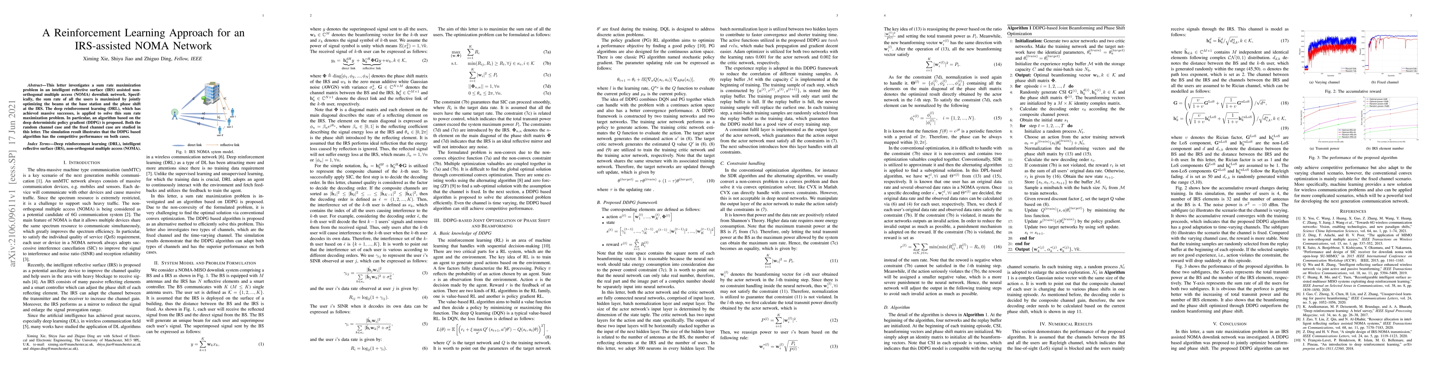 This paper proposes a deep reinforcement learning approach using DDPG to maximize the sum rate in an IRS-assisted NOMA network by jointly optimizing base station beams and IRS phase shifts. Simulation results show that the DDPG algorithm performs competitively in both random and fixed channel scenarios.