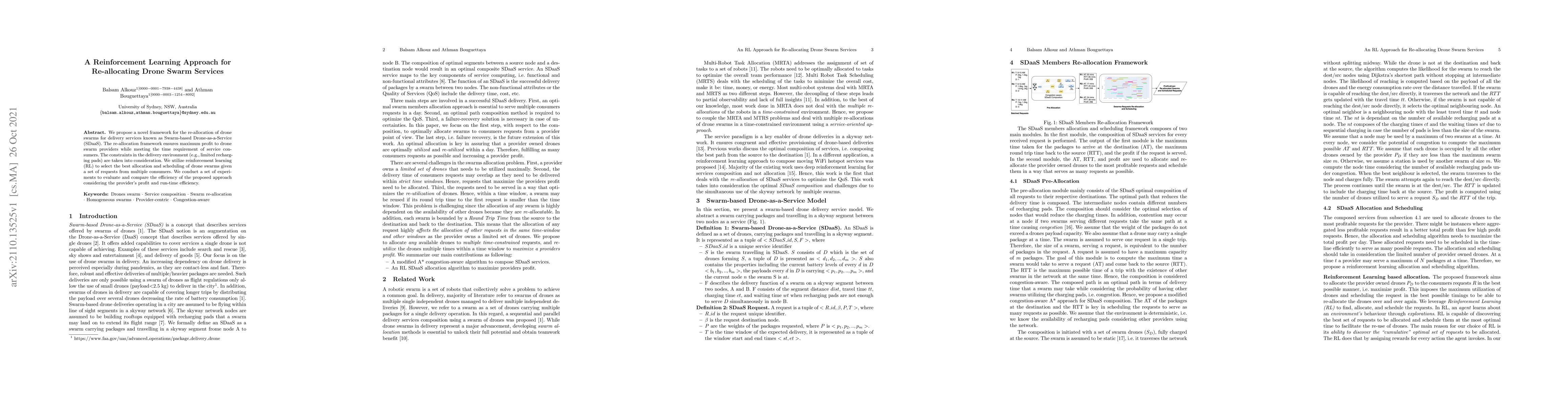 This paper introduces a reinforcement learning framework for optimizing drone swarm re-allocation in delivery services, termed Swarm-based Drone-as-a-Service (SDaaS). The approach maximizes provider profit while meeting consumer time requirements, considering constraints like limited recharging pads.