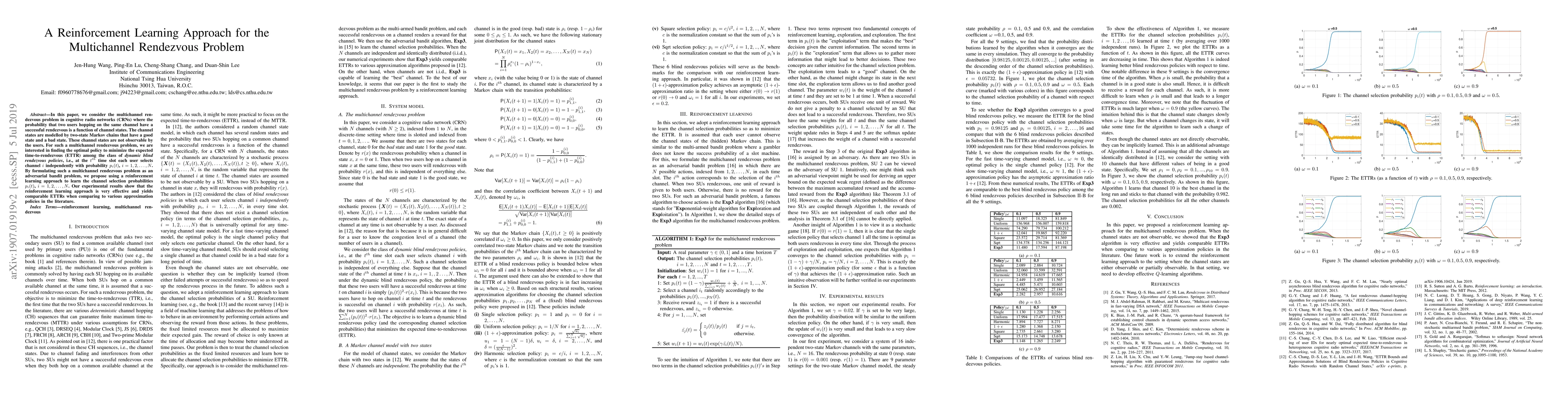 This paper proposes a reinforcement learning approach to solve the multichannel rendezvous problem in cognitive radio networks, aiming to minimize expected time-to-rendezvous by dynamically selecting channels based on unobservable channel states modeled as two-state Markov chains. Experimental results show the effectiveness of the approach compared to existing approximation policies.