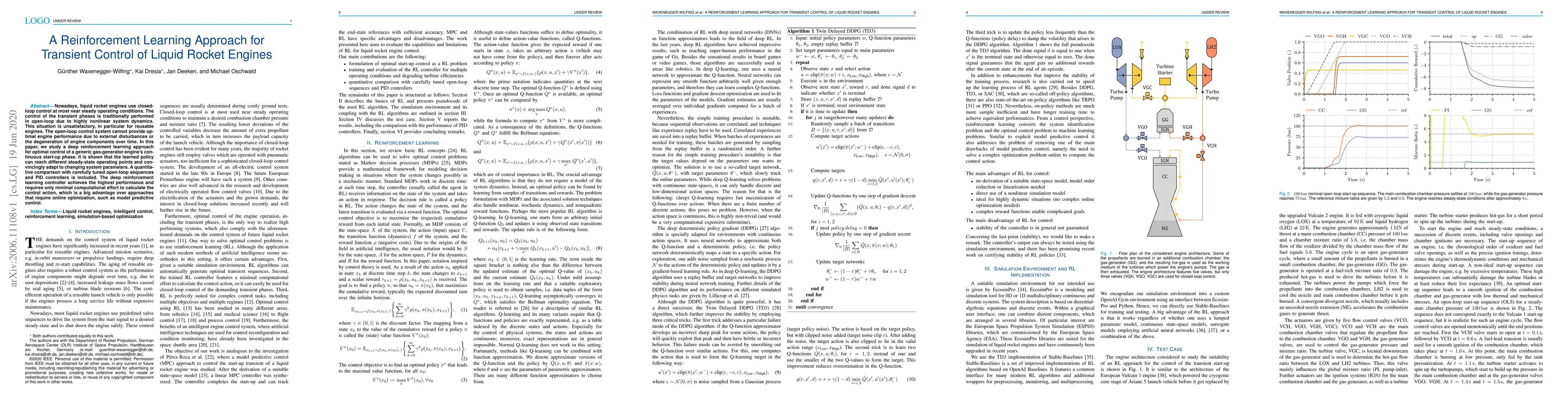 This paper proposes a deep reinforcement learning approach for optimal transient control of liquid rocket engines, specifically addressing the start-up phase. The method outperforms traditional open-loop and PID controllers, demonstrating superior adaptability and minimal computational effort.