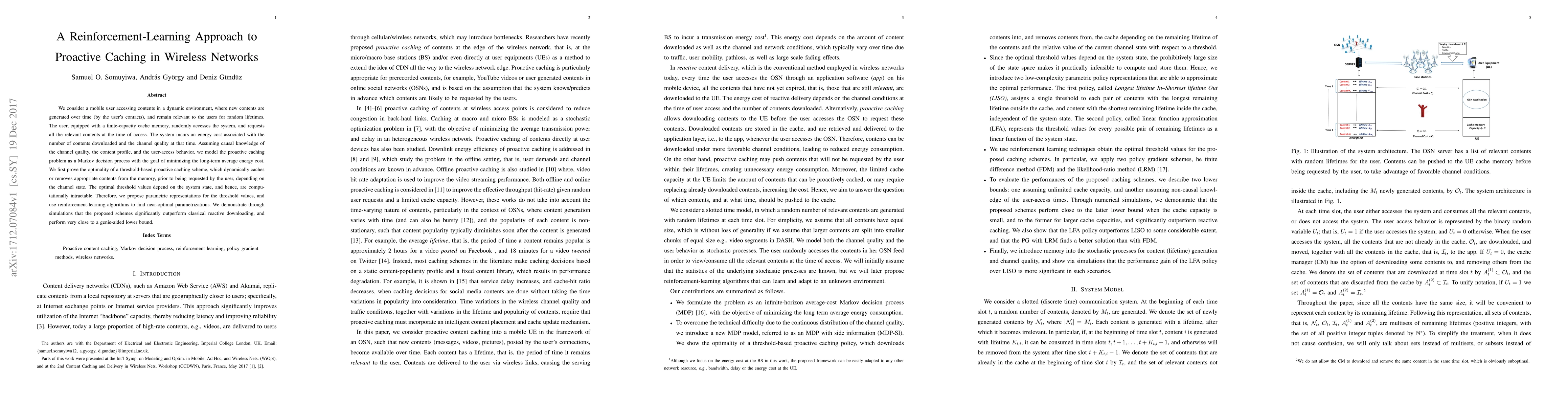 This paper proposes a reinforcement-learning approach to optimize proactive caching in wireless networks, aiming to minimize long-term average energy costs. The authors develop a threshold-based caching scheme and use reinforcement learning to find near-optimal solutions, demonstrating significant performance improvements over traditional reactive downloading.