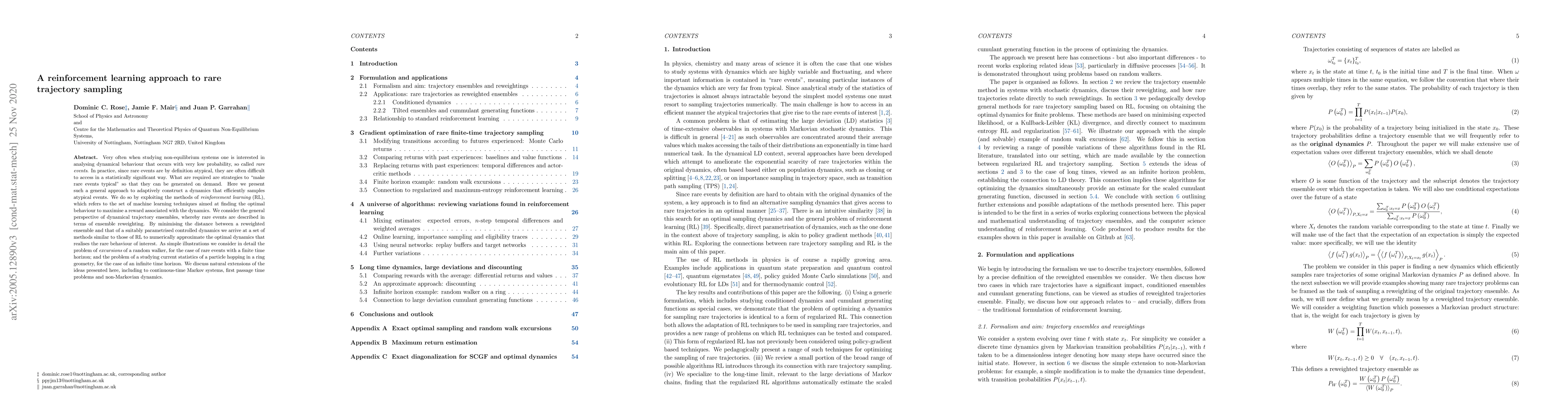 The paper's main technical contribution is the formulation of a reinforcement learning framework to adaptively construct dynamics that efficiently sample rare events, bridging the gap between reinforcement learning and the study of non-equilibrium systems.