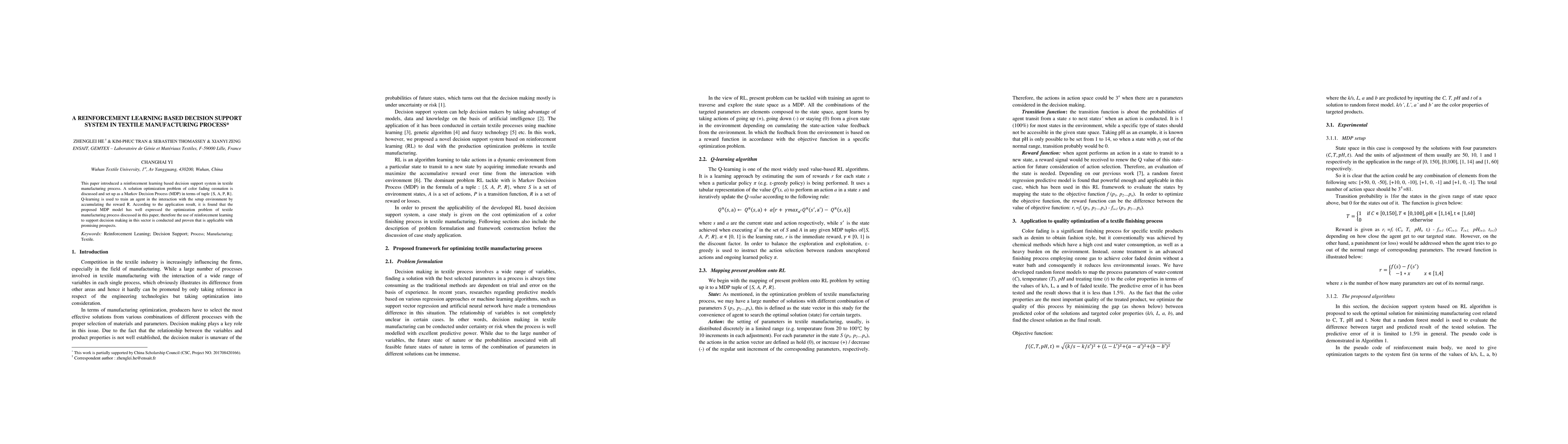 This paper introduced a reinforcement learning based decision support system in textile manufacturing process. A solution optimization problem of color fading ozonation is discussed and set up as a Markov Decision Process (MDP) in terms of tuple {S, A, P, R}. Q-learning is used to train an agent in the interaction with the setup environment by accumulating the reward R. According to the application result, it is found that the proposed MDP model has well expressed the optimization problem of textile manufacturing process discussed in this paper, therefore the use of reinforcement learning to support decision making in this sector is conducted and proven that is applicable with promising prospects.