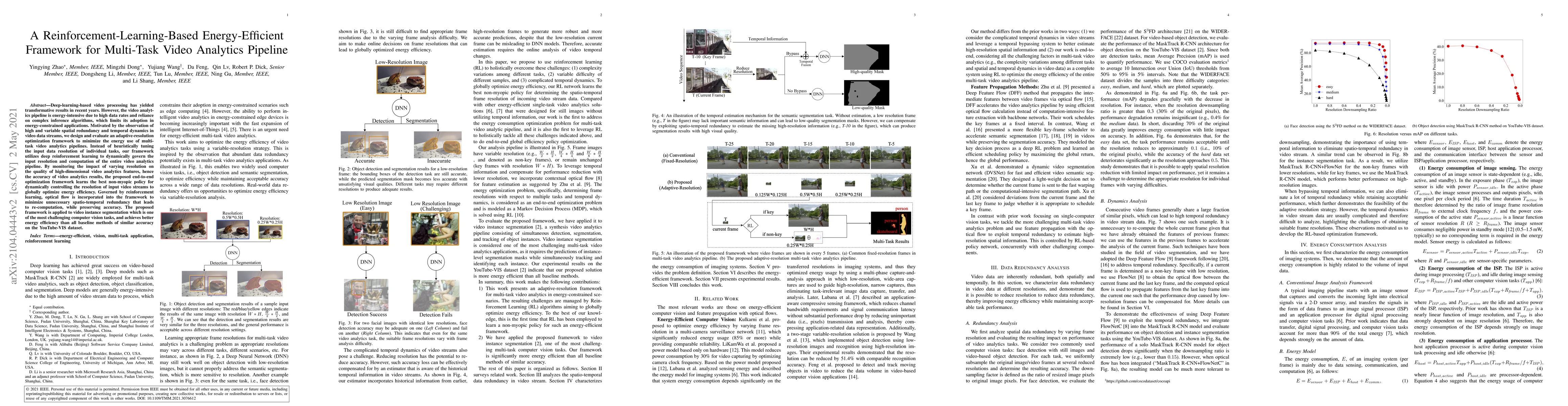 This paper proposes a reinforcement-learning-based framework to optimize energy efficiency in multi-task video analytics pipelines by dynamically adjusting input resolution and computation. The adaptive-resolution approach, governed by reinforcement learning, minimizes energy use while maintaining accuracy, especially in challenging tasks like video instance segmentation.