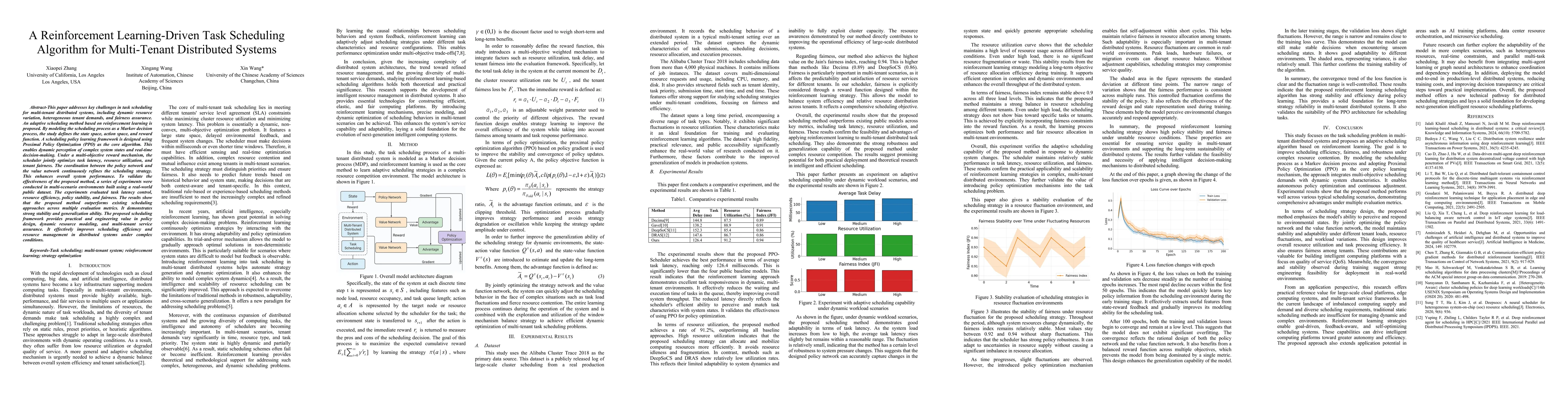 This paper addresses key challenges in task scheduling for multi-tenant distributed systems, including dynamic resource variation, heterogeneous tenant demands, and fairness assurance. An adaptive scheduling method based on reinforcement learning is proposed. By modeling the scheduling process as a Markov decision process, the study defines the state space, action space, and reward function. A scheduling policy learning framework is designed using Proximal Policy Optimization (PPO) as the core algorithm. This enables dynamic perception of complex system states and real-time decision-making. Under a multi-objective reward mechanism, the scheduler jointly optimizes task latency, resource utilization, and tenant fairness. The coordination between the policy network and the value network continuously refines the scheduling strategy. This enhances overall system performance. To validate the effectiveness of the proposed method, a series of experiments were conducted in multi-scenario environments built using a real-world public dataset. The experiments evaluated task latency control, resource efficiency, policy stability, and fairness. The results show that the proposed method outperforms existing scheduling approaches across multiple evaluation metrics. It demonstrates strong stability and generalization ability. The proposed scheduling framework provides practical and engineering value in policy design, dynamic resource modeling, and multi-tenant service assurance. It effectively improves scheduling efficiency and resource management in distributed systems under complex conditions.