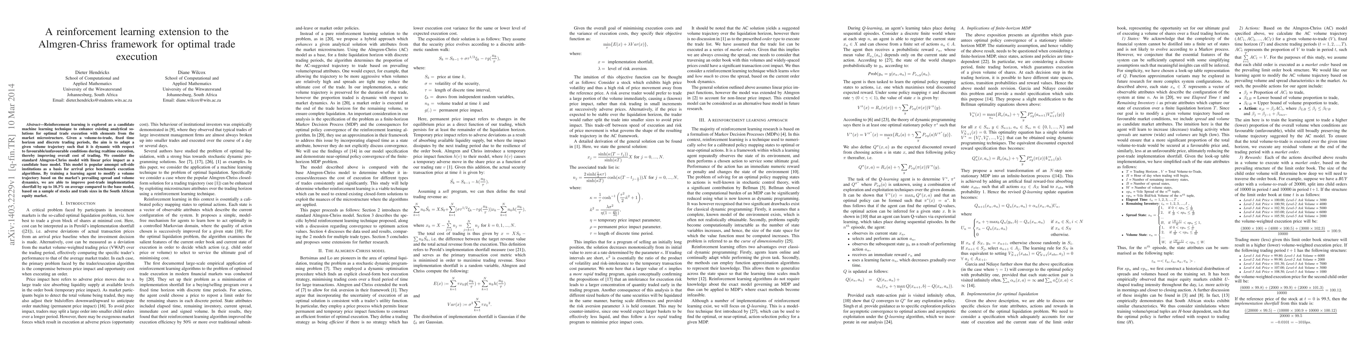 This paper explores reinforcement learning to enhance the Almgren-Chriss model for optimal trade execution, achieving up to a 10.3% improvement in post-trade implementation shortfall by dynamically adjusting volume trajectories based on market conditions. The study focuses on the South African equity market.