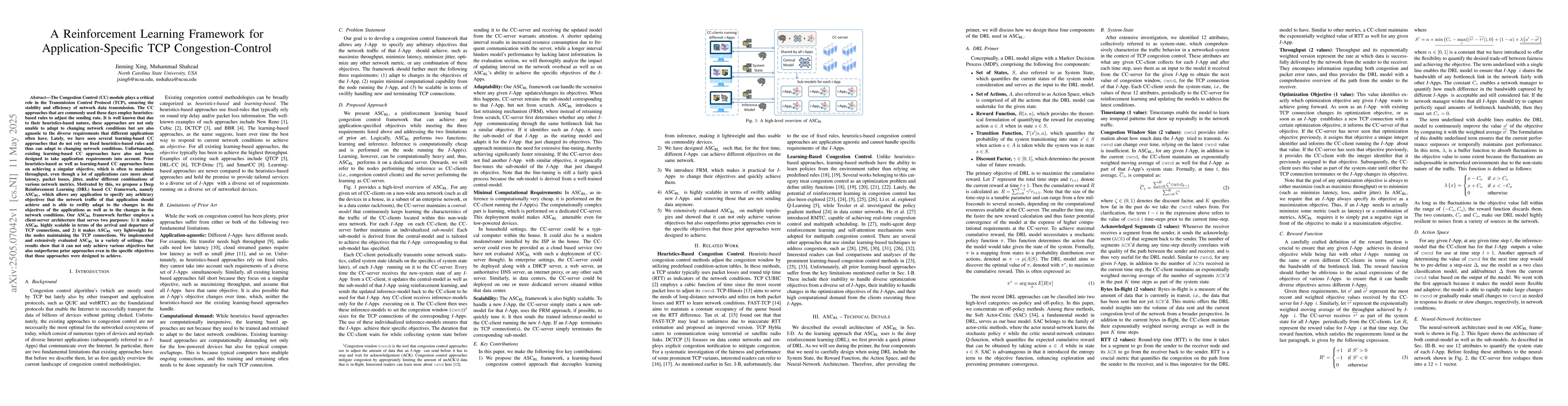 A new Deep Reinforcement Learning framework, ASC, is proposed to adapt TCP congestion control to diverse application requirements, outperforming existing approaches in various settings.