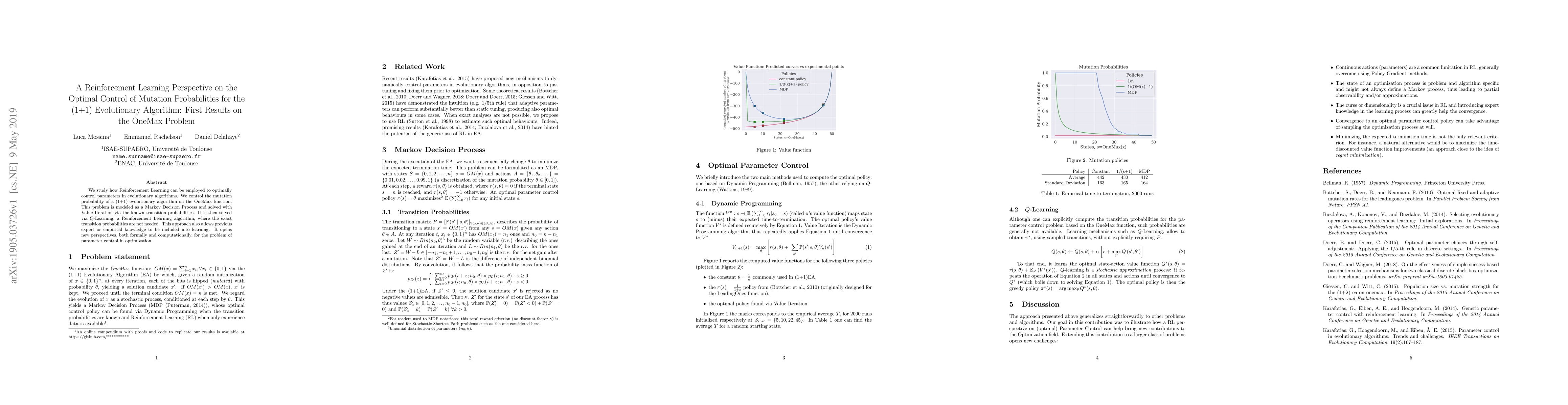 We study how Reinforcement Learning can be employed to optimally control parameters in evolutionary algorithms. We control the mutation probability of a (1+1) evolutionary algorithm on the OneMax function. This problem is modeled as a Markov Decision Process and solved with Value Iteration via the known transition probabilities. It is then solved via Q-Learning, a Reinforcement Learning algorithm, where the exact transition probabilities are not needed. This approach also allows previous expert or empirical knowledge to be included into learning. It opens new perspectives, both formally and computationally, for the problem of parameter control in optimization.