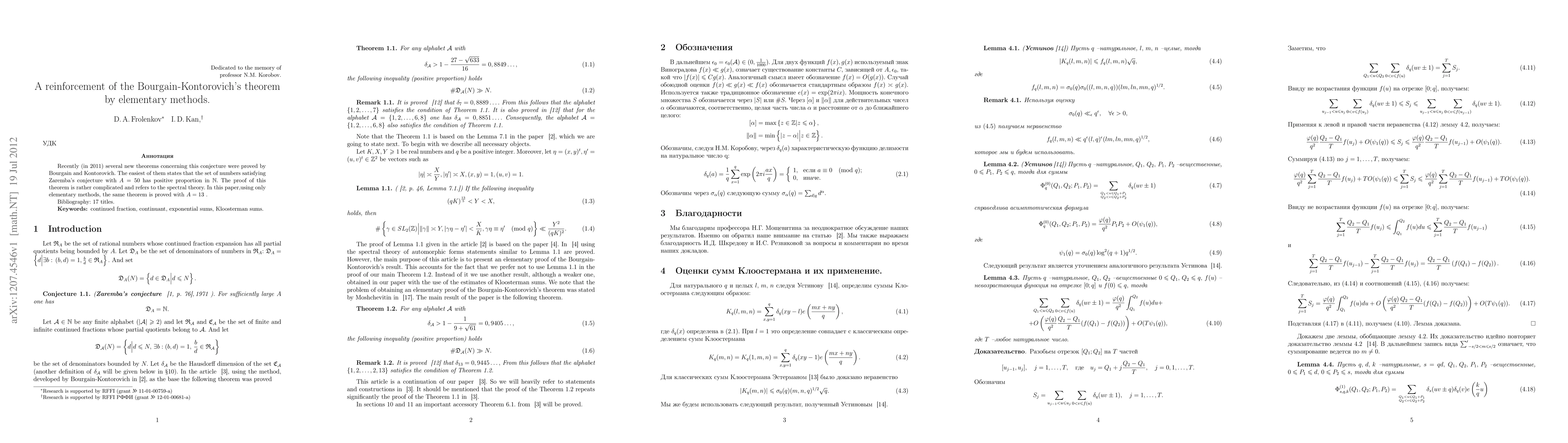 Recently (in 2011) several new theorems concerning this conjecture were proved by Bourgain and Kontorovich. The easiest of them states that the set of numbers satisfying Zaremba's conjecture with A=50 has positive proportion in $\N.$ The proof of this theorem is rather complicated and refers to the spectral theory. In this paper,using only elementary methods, the same theorem is proved with A=13 .